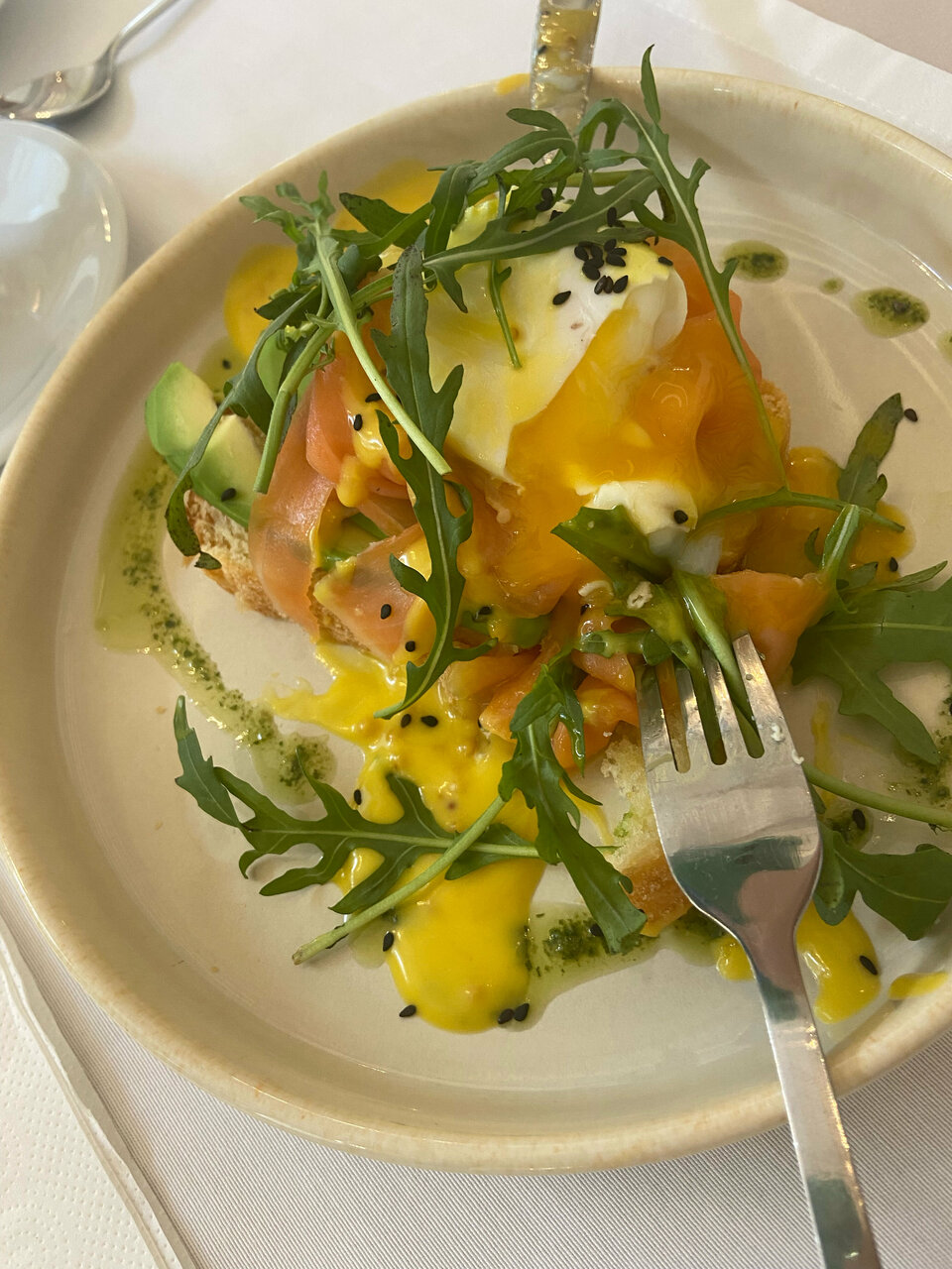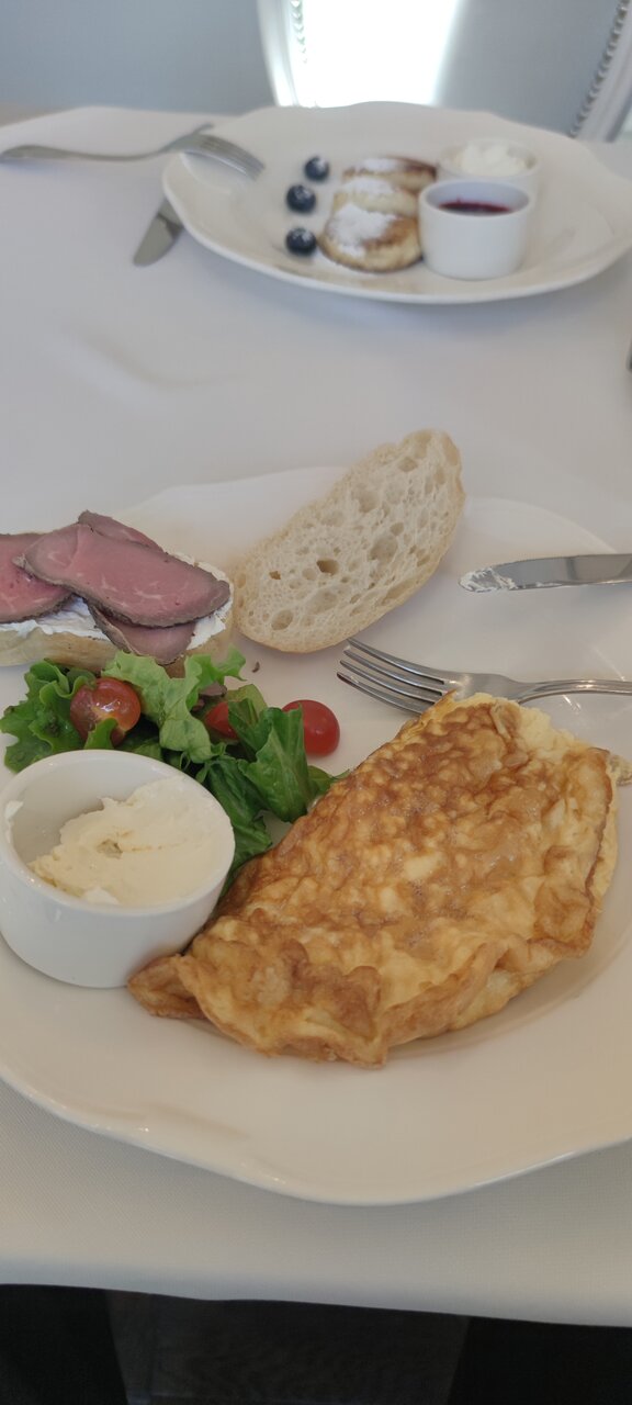 Завтрак по меню. Стоимость от 1000 рублей. Можно выбрать горячее блюдо - бриошь с яйцами Пашот или омлет с гарнировкой, сырники с вишневым вареньем и сметаной, яичницы, каши. Разнообразить можно лососем, креветками, авокадо, ростбифом, сосисками.