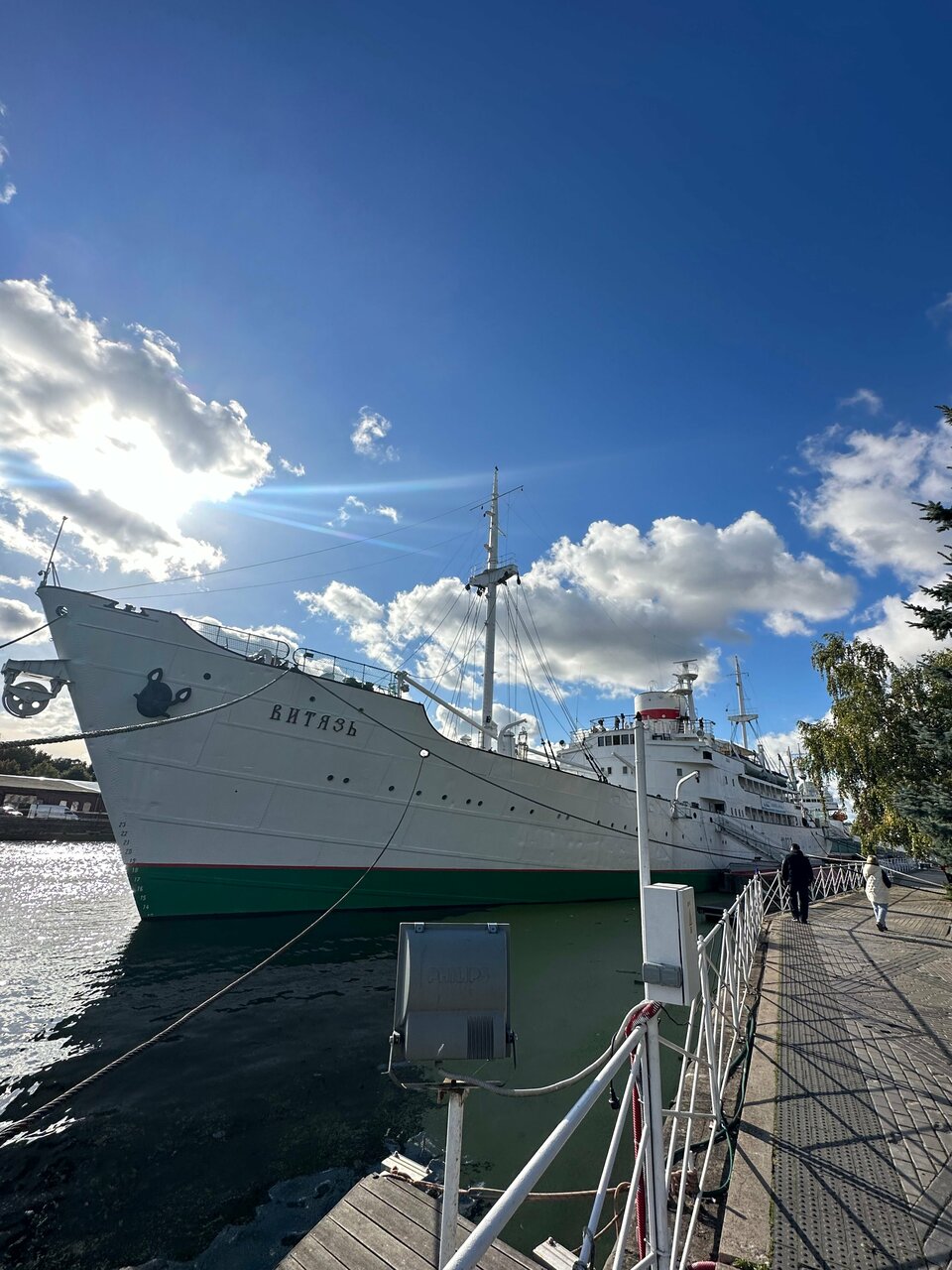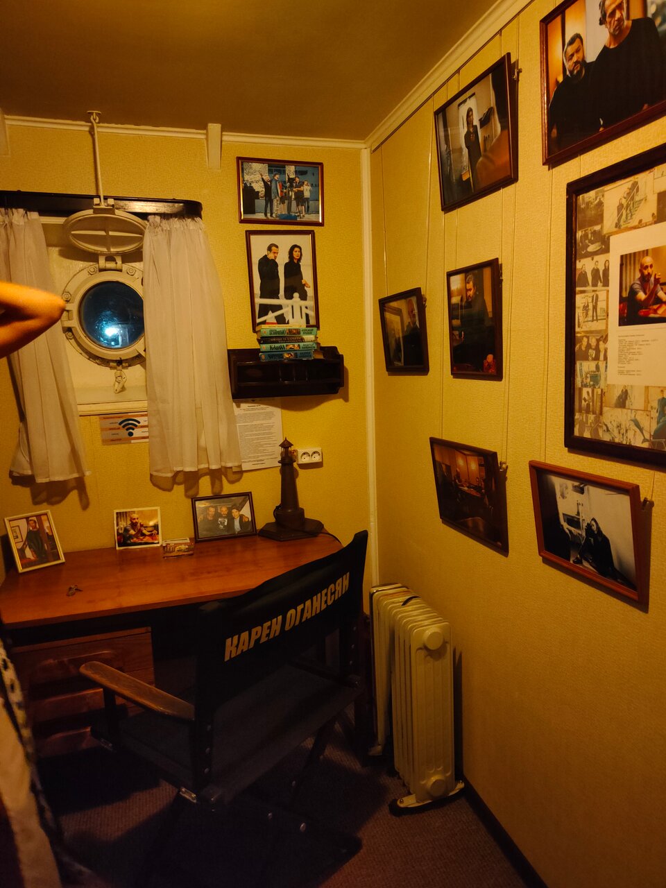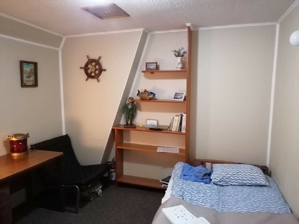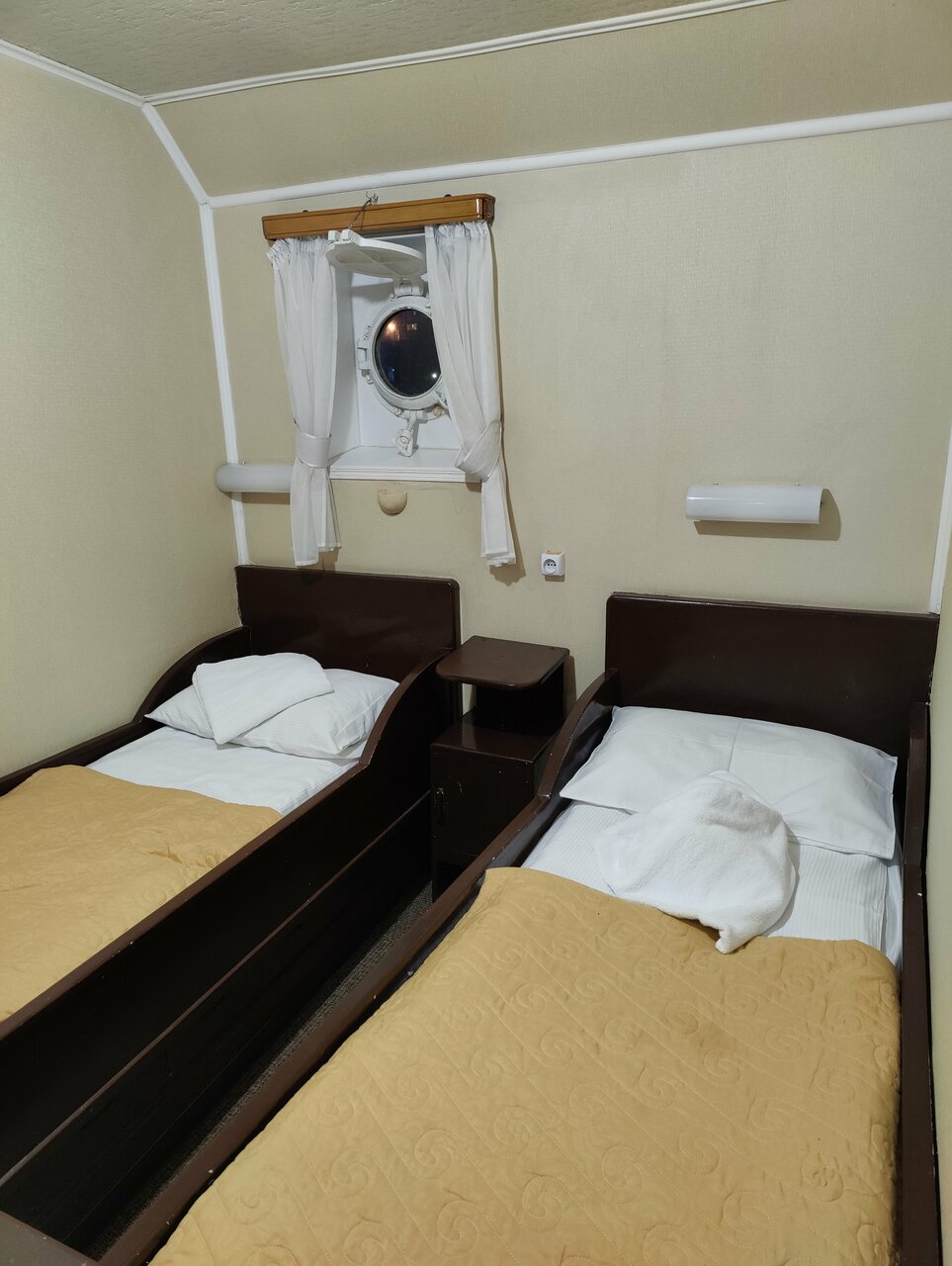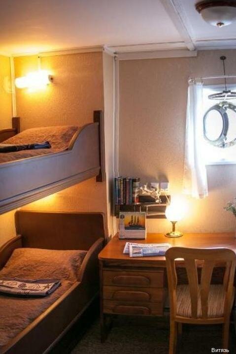 Простенький отель, на воде. В кубрике есть микроволновка, чайник, холодильник и телевизор. Из плюсов: проживание на легендарном НИС ‘Витязь’ Из минусов: полное отсутствие звукоизоляции между каютами.