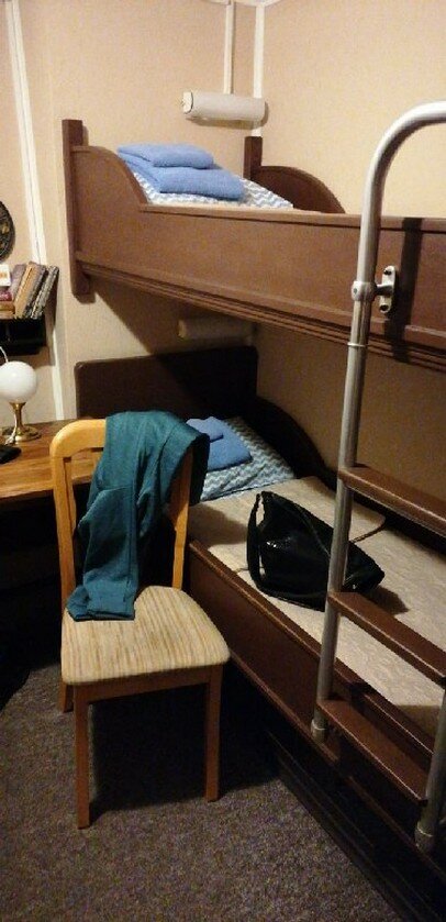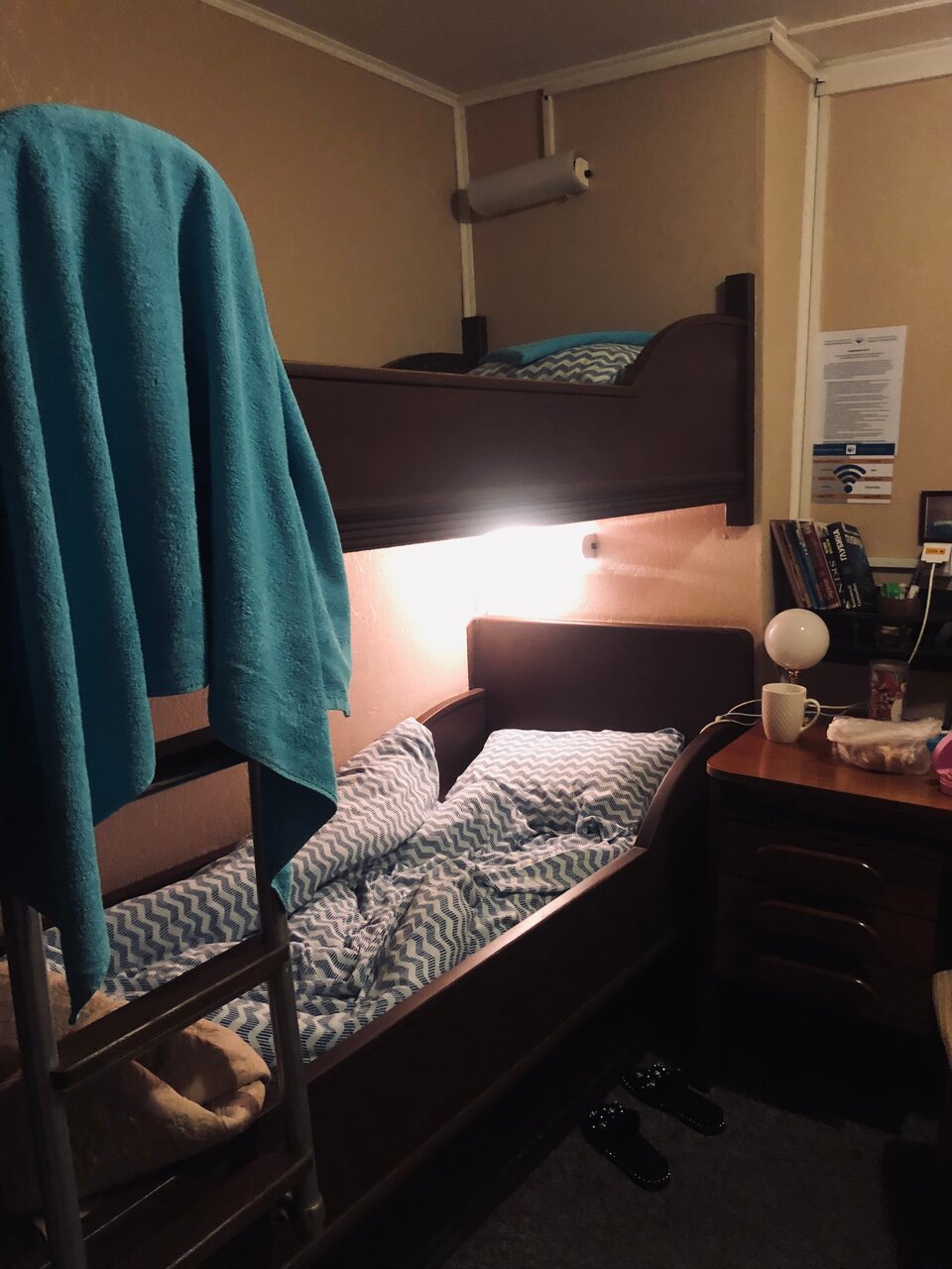 Необычный отель. Были в марте. В каютах установлены обогреватели, постельные принадлежности выдали, есть Wi-Fi, кухня со всем необходимым (посуда, чайник, микроволновка, холодильник, кулер…) , туалет и душевые. Если проживаешь на корабле, экскурсия-бесплатная.