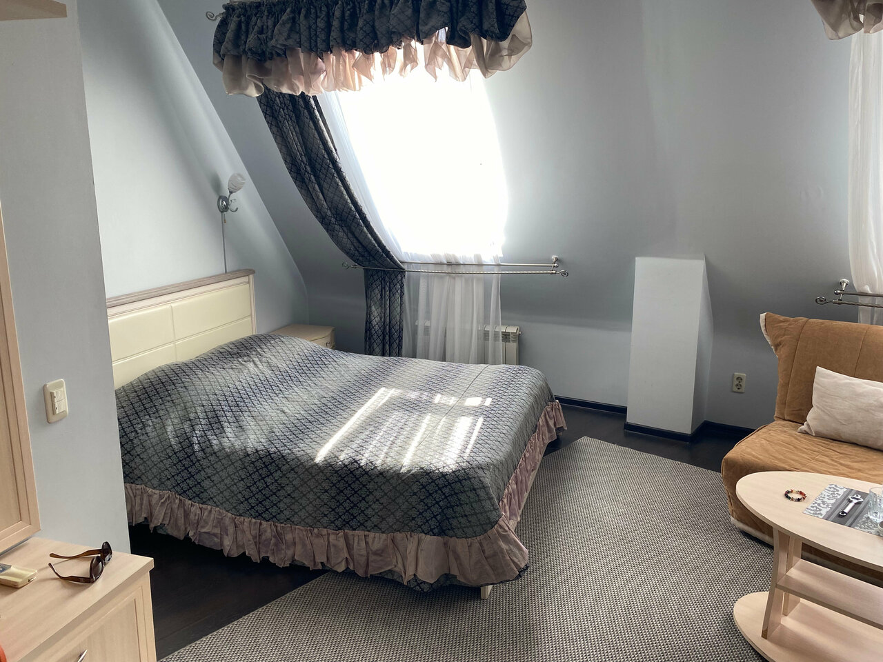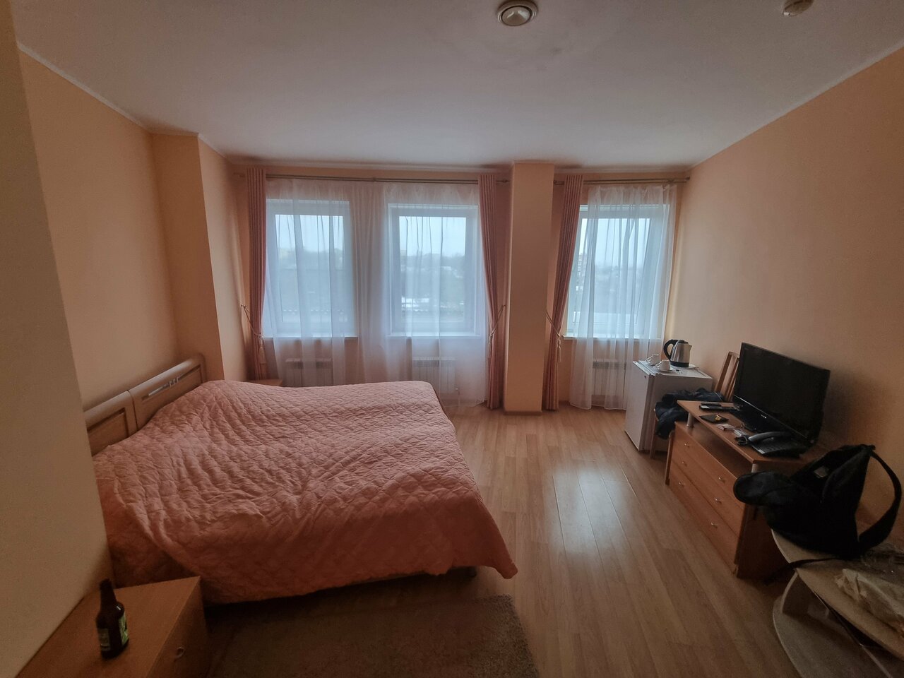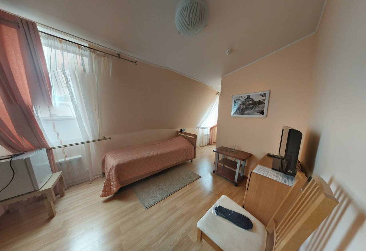 В номере за 4 тысячи: в душе невозможно настроить нормальную температуру воды (обливает кипятком или ледяной водой). Кофе можно выпить только после 11 и вообще поесть (так как кухня раньше не работает). Нет зубной пасты, одноразовой щётки, ватных дисков, халата, и тд. Кондиционер старинный, работает только на одной программе, а пульт от него работает только если приноровиться. Окна в номере были закрыты, но всю ночь нас одолевали комары. Вид из номера во двор к соседям и на стоянку. Бассейн очень маленький. Бронировала разглядывая красивые фото с большим бассейном, но в живую все иначе. Шкафчики в раздевалке не закрываются, халатов чтобы добраться из бассейна в номер — нет. Дополнительного полотенца и тапочек тоже нет. В определенное время купаться нельзя. Из плюсов: приятный персонал и чистый номер.