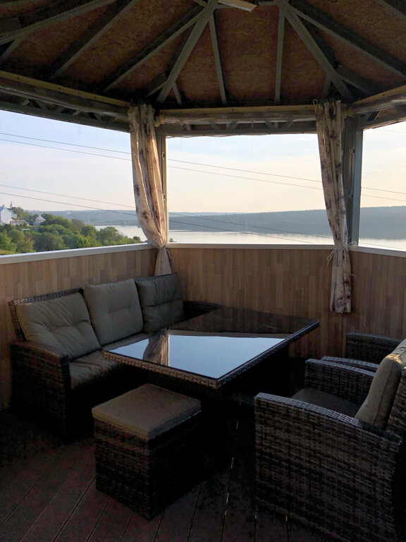 Очень красивое место. Вид открывается на Яченевское водохранилище. Были на свадьбе в банкетном зале. Саму гостиницу из собственного опыта оценить не могу, но по заявленным фото на сайте гостиницы можно оценить на 8 из 10. Планируем обязательно остановиться в ней с ночевой в люксе или полулюксе — понравился дизайн номеров.
