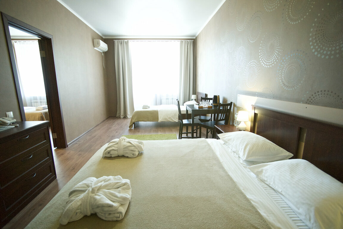 Достаточно просторные номера. Все чисто. Есть тапочки и туалетные принадлежности. Завтрак отличный! В номере нет чайника, но есть кулер на этаже. Своя парковка. В общем, все отлично, но далеко от центра. Если на машине, не проблема.
