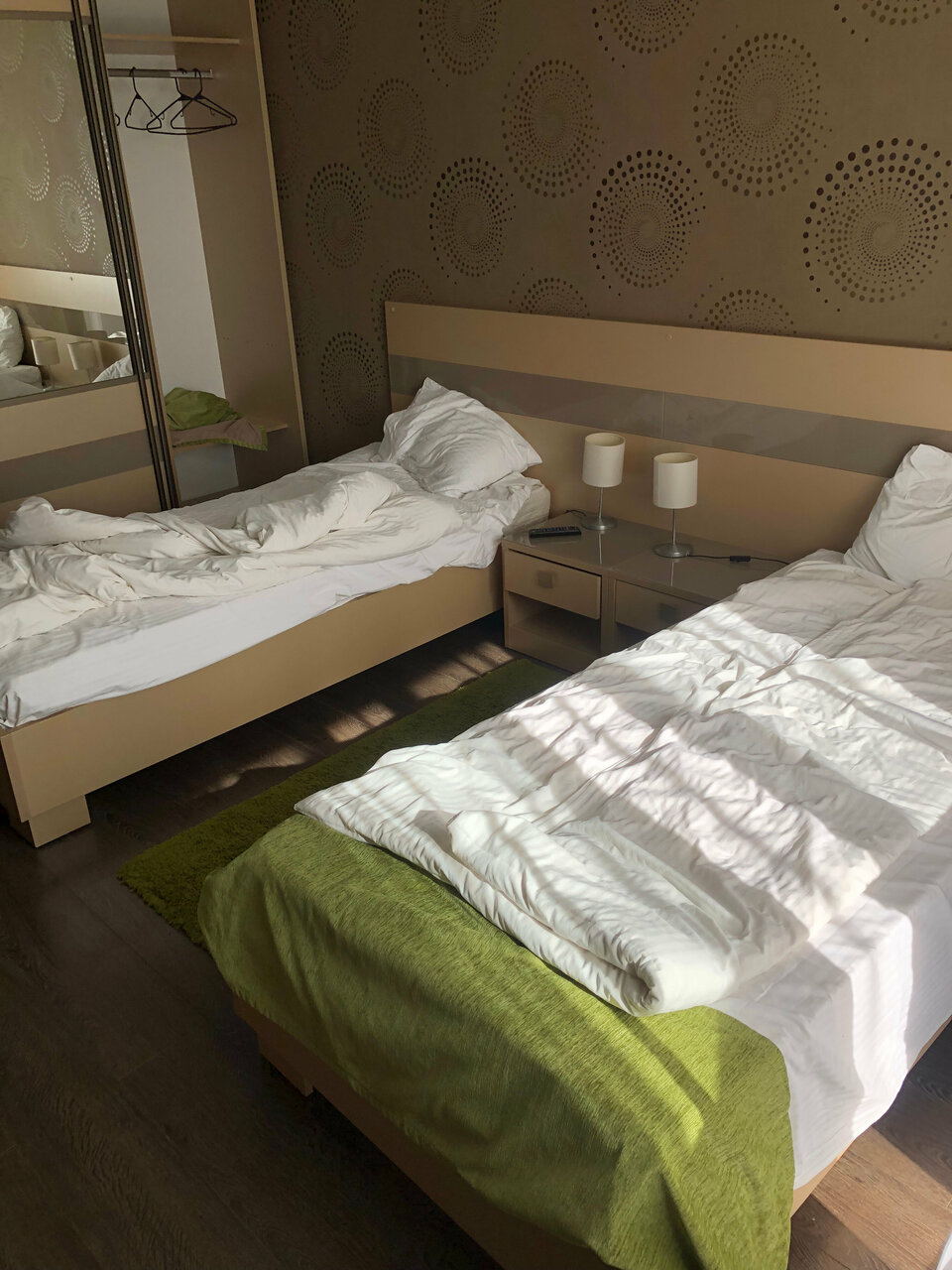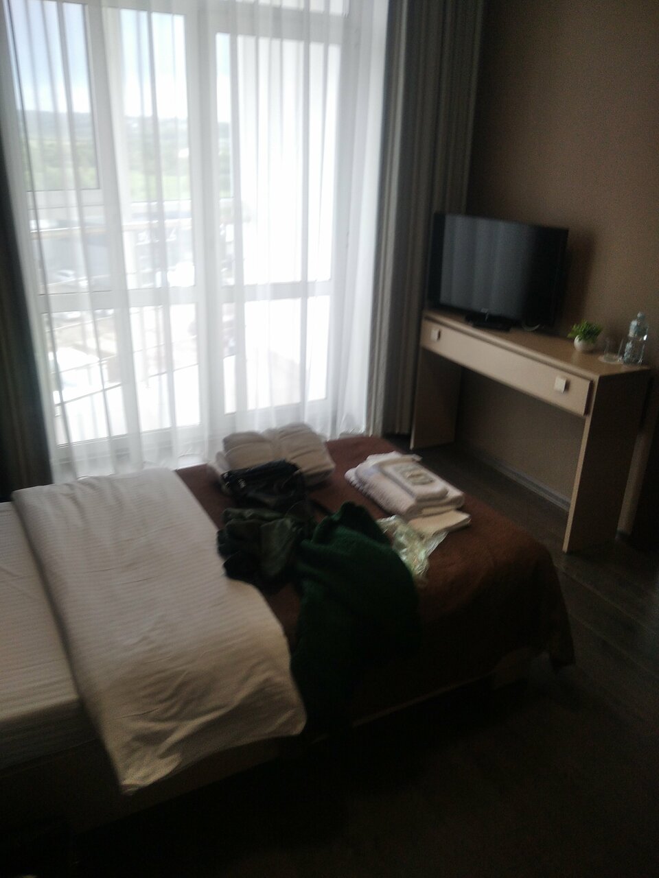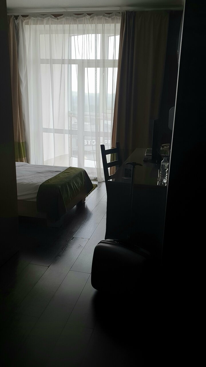 Нормальный отель, но находится рядом с трассой и заправкой. Ну и шторы стоит поменять — половина слетело с петель + сильно пропускают свет