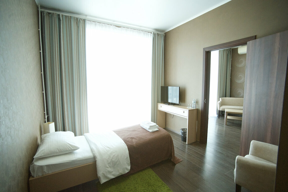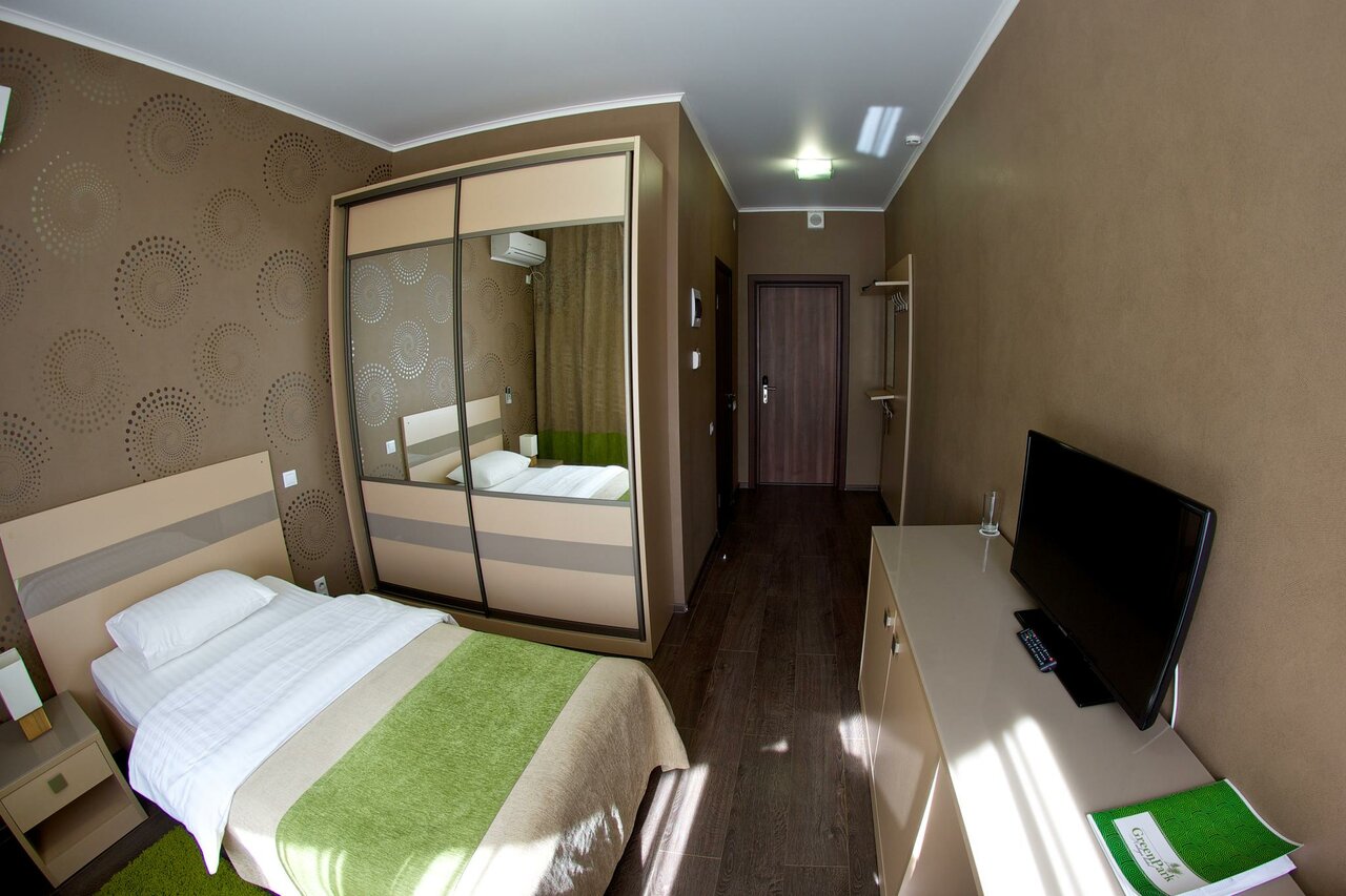 Порадовало всё: очень по-европейски. Номер брали двухместный, очень просторно, аккуратно, на окне москитка, что немаловажно летом, все номера с балконами, у нас был на сосновую рощу. Приятным бонусом стала скидка тем, кто посещает МНТК, так что лучше бронировать по телефону, а не на сайте. Номер уютный, красивый, много места, две бутылки воды были в номере, кроме того есть куллер на этаже. Вечером кушали в ресторане – очень вкусно, порции большие; брали номер с включенным завтраком – шведский стол с хорошим выбором блюд тоже порадовал (сок бы добавить хотя бы апельсиновый). В общем, остались довольны, через время снова посещать Калугу – вернёмся именно в Грин Парк