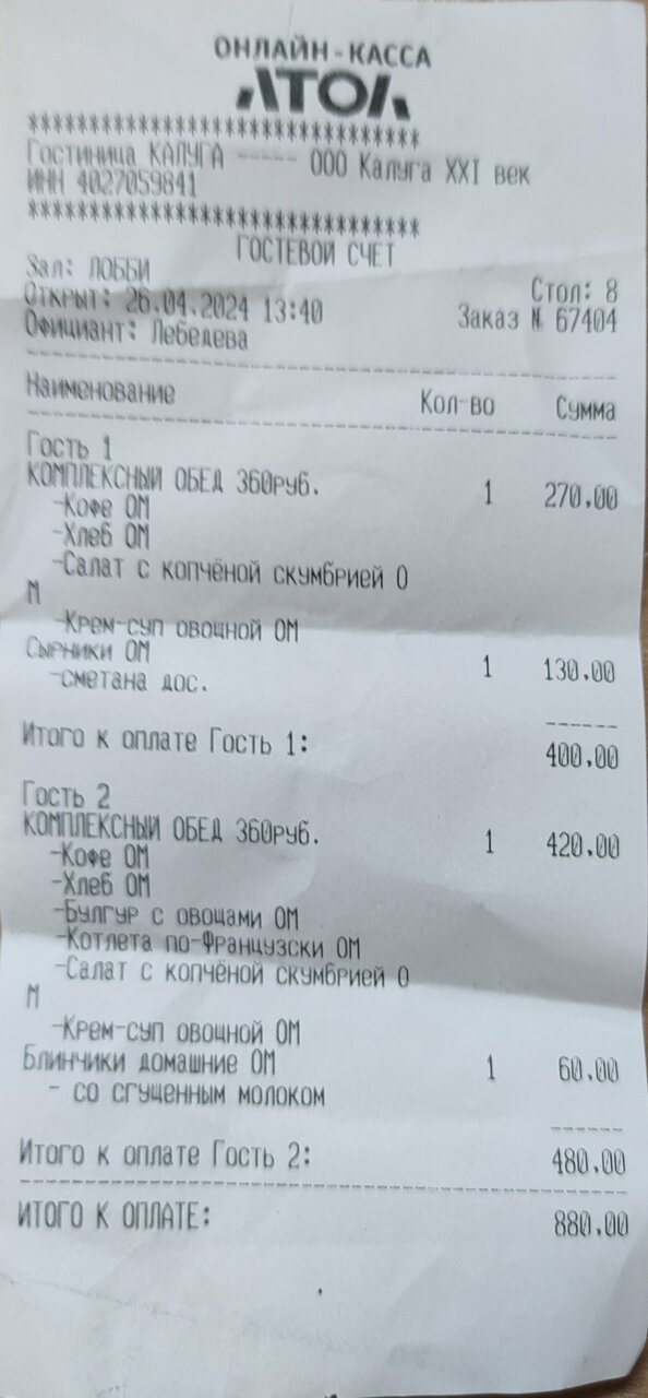 Очень приятный город Калуга. Гостиница хорошая, номер на 2 человек большой, санузел чистый, без запаха. У нас только был обед — 1,2,салатик и компот, все просто и вкусно, завтрак — шведский стол, все вкусно, пустые тарелки сразу заполнялись. Обслуживание быстрое и вежливое. Все понравилось, только погода подвела