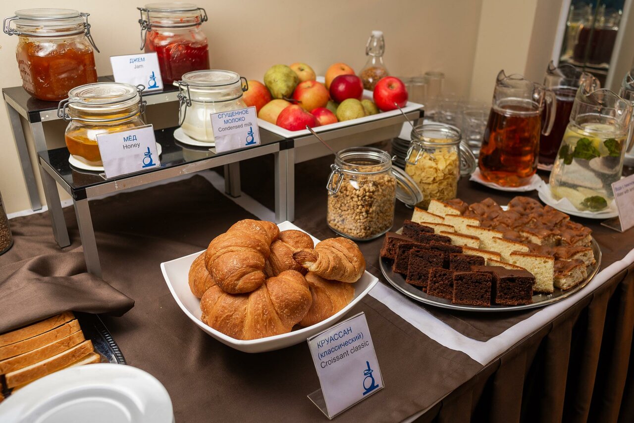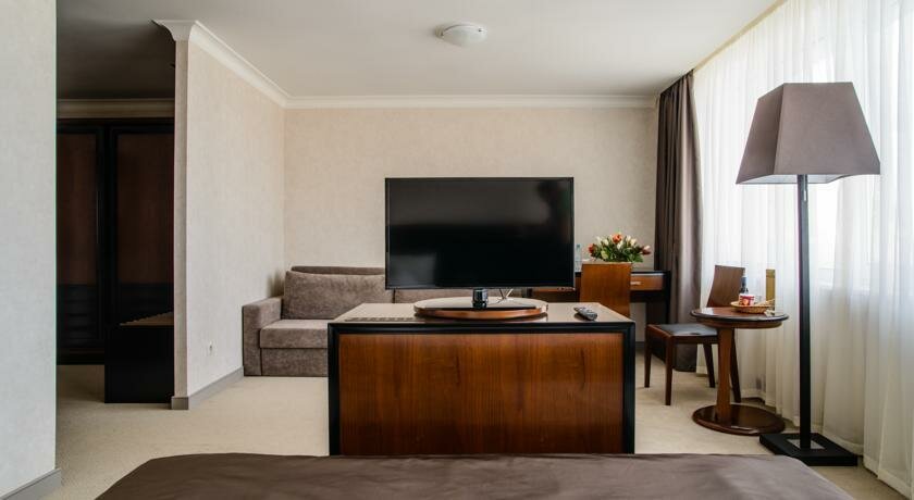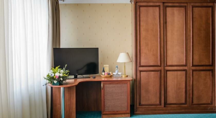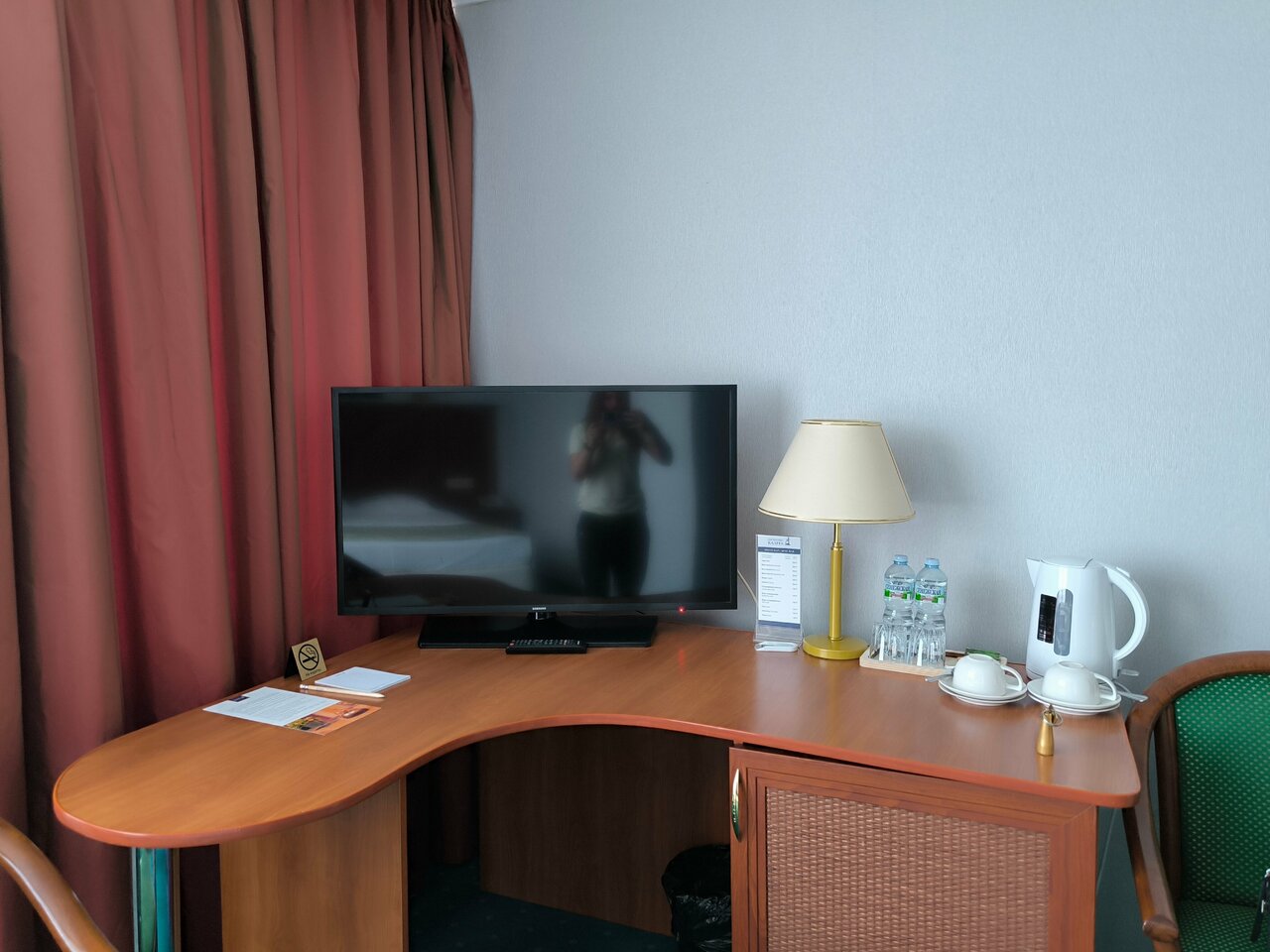 Хорошая гостиница. Номера достаточно большие. Жил в номере комфорт. Хорошая кровать, большой телевизор. В номере чай пакетированный, вода и чайник. Есть холодильник, содержимое не включено в стоимость. В ванной присутствует зубной набор. Ужин на твердую 4+. Брал мясо по-французски, жестковато. Завтрак на 4+. Шведский стол.