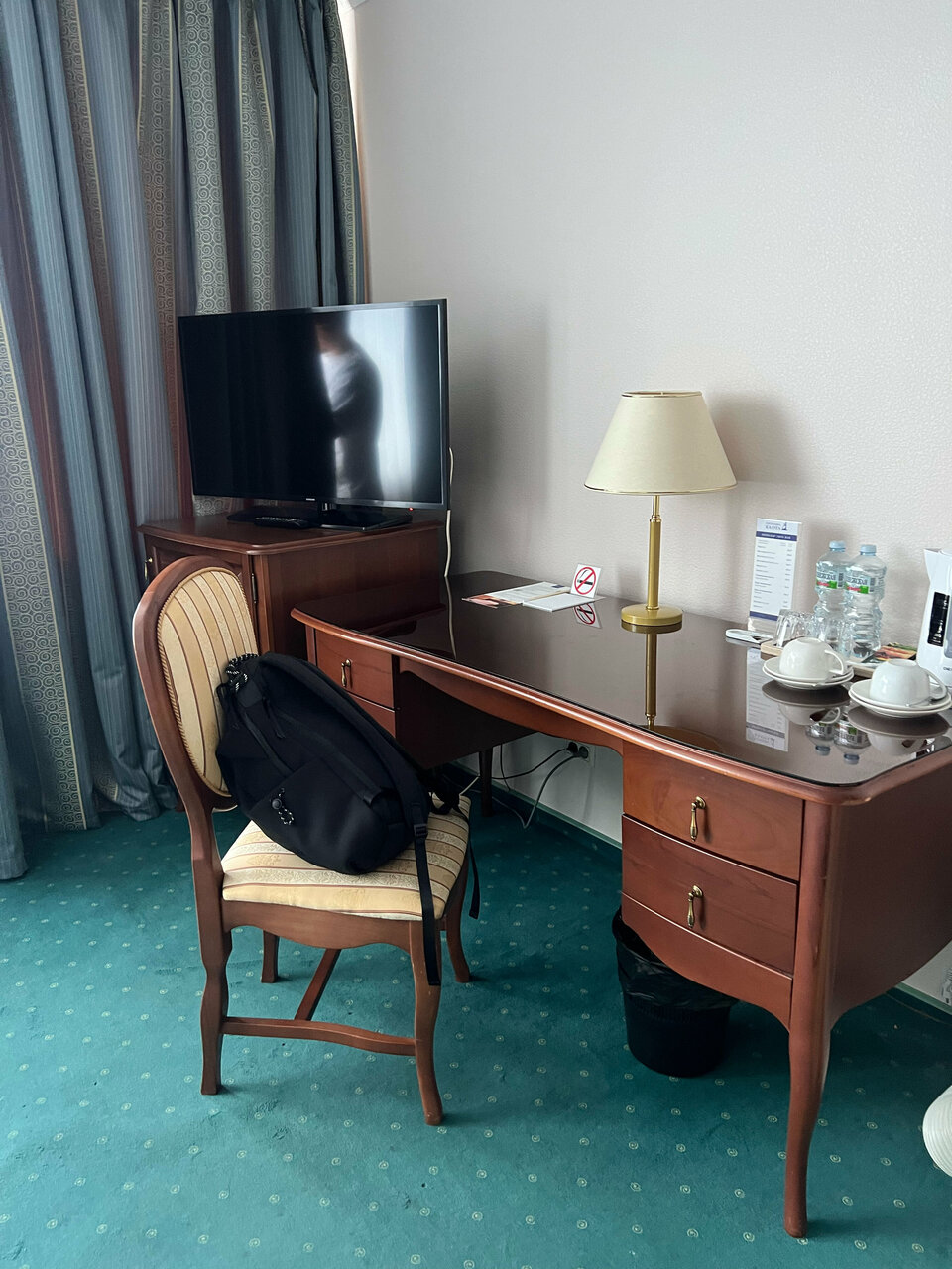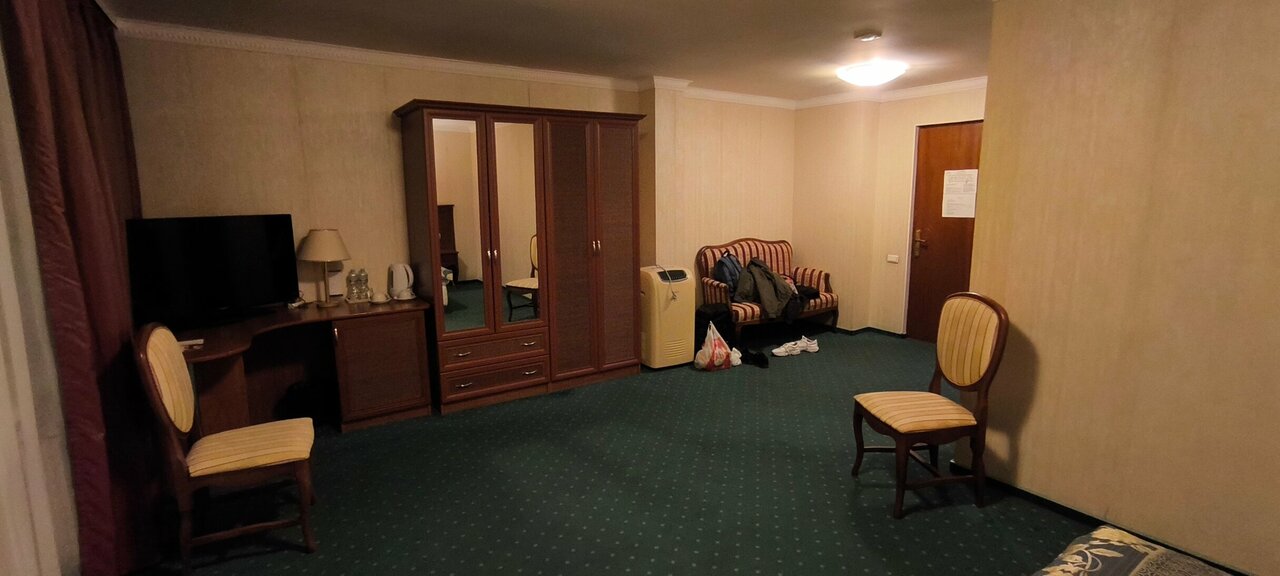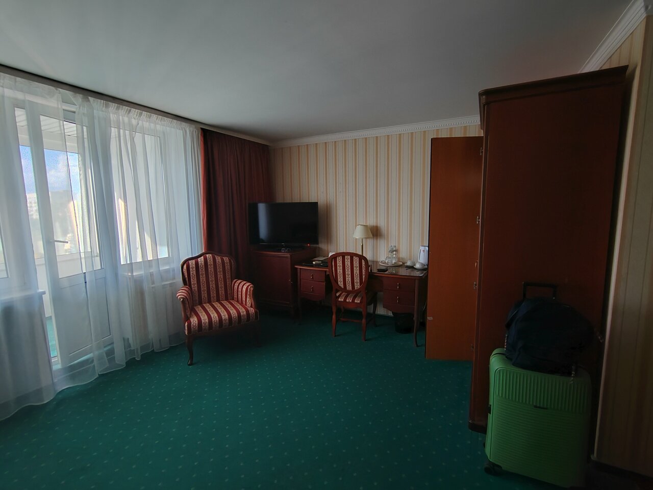 Сама гостиница классического советского типа. Интересно, что в номерах на восьмом этаже были халаты и дополнительные шампуни и кондиционер в ванной. Плюс было четыре подушки. А на седьмом этаже халатов и этих аксессуаров для ванной не было. И было две подушки. Хотя номера на седьмом этаже стоят дороже и считаются более высоким классом. Совсем нет комнаты с тренажёрами. Ни с какими. Интернет у меня не подключился в принципе. Но у некоторых гостей на более простых телефонах подключился. Многие туристы спрашивают про бассейн. Его нет. Завтраки средние. Неплохие, но очень простые. В этой гостинице непонятно, что делать вечером. В командировке вечером я обычно бегаю по дорожке. Здесь же вечером вообще нечем заняться.