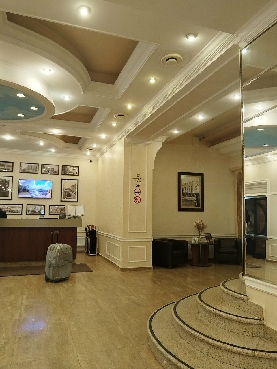 Хорошая гостиница. Расположена в центре города, все основные достопримечательности рядом. Постройка советских времён,но проведён хороший ремонт, номера разные,чисто и уютно. Персонал доброжелательный. Завтраки отличные. Имеется парковка. Анекдот. В гостинице у одинокого мужчины вечная дилемма: пригласить женщину с пониженной социальной ответственностью или съесть орешков из мини-бара. Стоит и то и то одинаково.