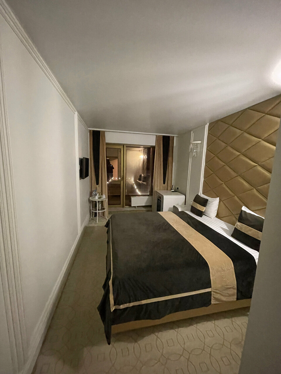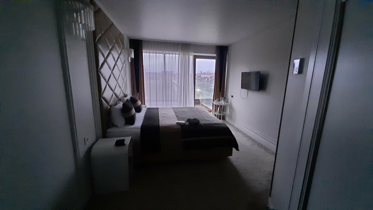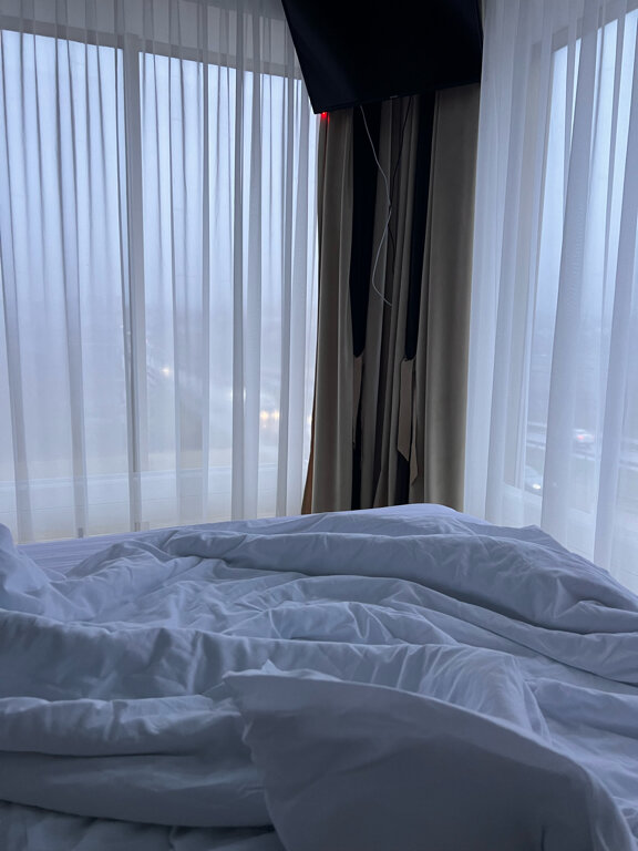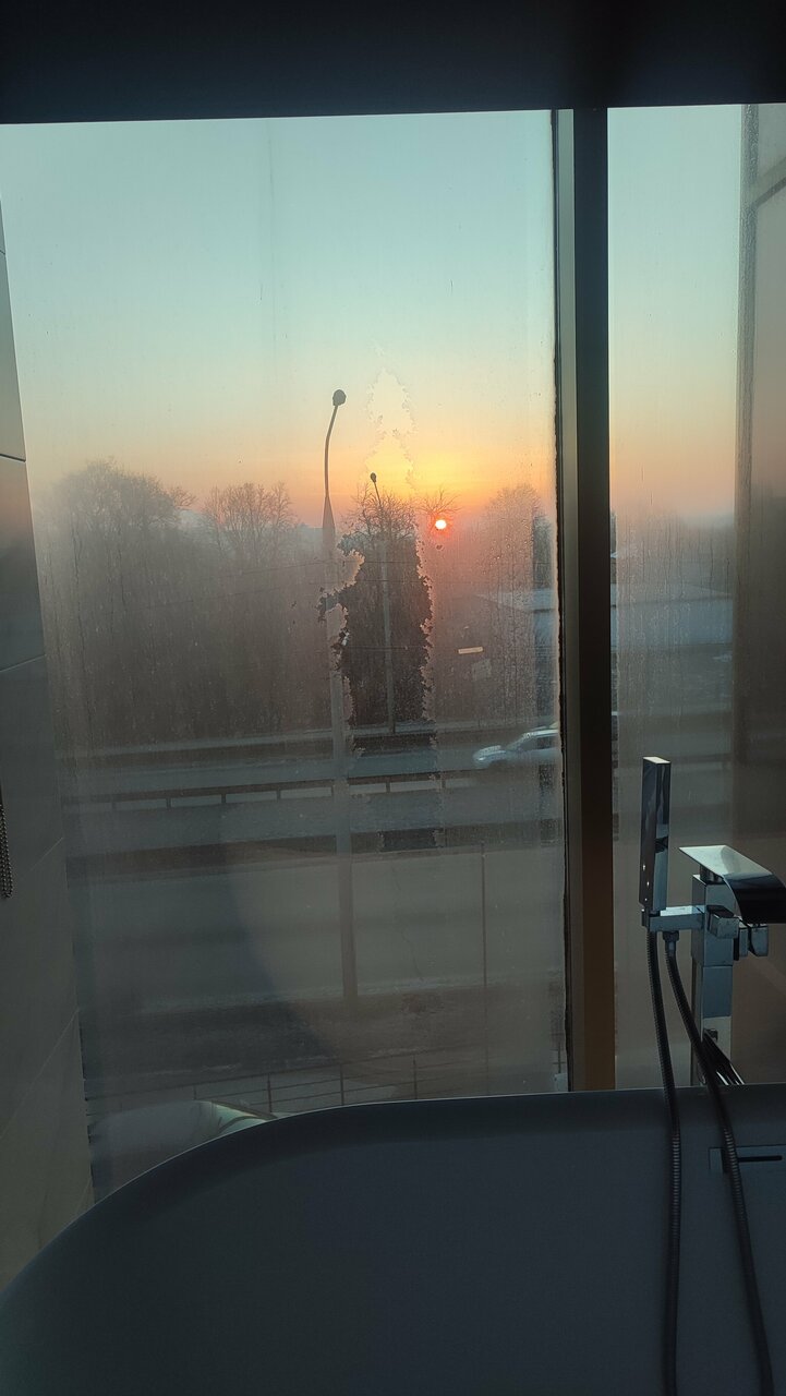 Гостиница вполне комфортная, кровати удобные. Располагается недалеко от центра. Поставила 4 звёзды, так как не работал ресторан во время нашего проживания, поэтому не было завтраков. Да и очень странное решение с отсутствием дверцы на душе, но это несущественно. Немного слышно дорогу ночью, но комфортная кровать позволила быстро уснуть. Красивый вид из панорамного окна ночью.