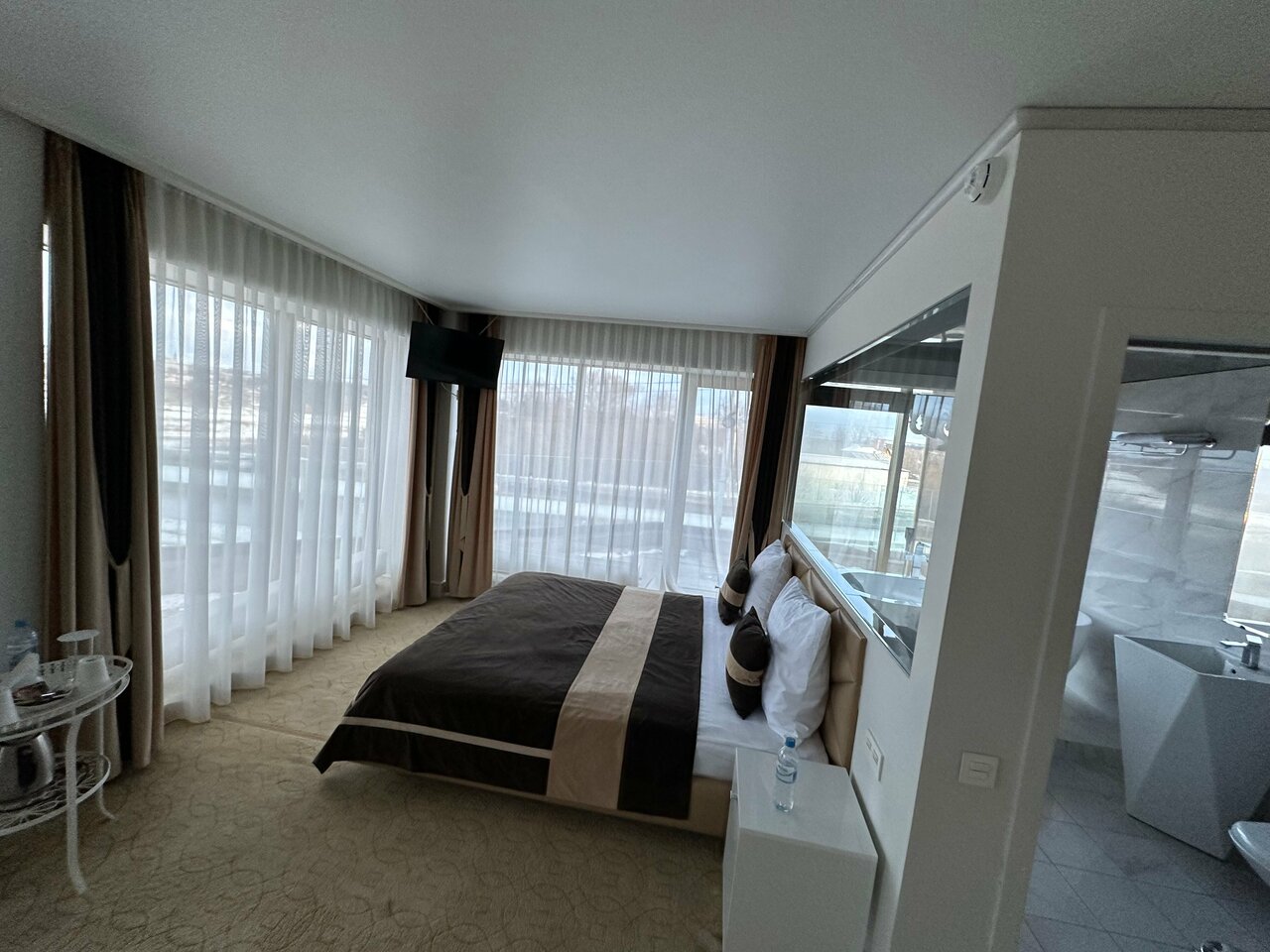 Хороший отель. Очень чисто, уютно, красивый дизайн. Отдыхала в номере Люкс — чисто, предоставляются все принадлежности, вплоть до бритвенного набора и халатов. Классный дизайн — панорамные окна, 2 балкона, огромное окно между ванной и комнатой, в ванной потрясная отдельностоящая ванная, большое окно. Очень понравилось!