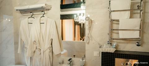 Ранее уже заселялись в Отель комета. Были довольны и в этот раз решили остановиться с ребёнком в этом же отеле. Обычно, всегда осматриваю номер и если что-то не устраивает, приглашаю администратора и нам меняют номер или исправляют. В этот раз мы заселились в 23:00 и утром мы пришли в шок. Это номер категории люкс. Из плюсов: красивый вид из окна, удобное расположение, есть все необходимое(туалетные принадлежности, кофе, чай, чайник, сейф, холодильник). Абсолютно белоснежные простыни и полотенца, халаты. Ванна. Из минусов: минусы — это то, что на фото. Сломанный диван, грязные тумбы, столы, ребёнок на коверном покрытии нашёл иголку, отвалившаяся плитка, чайник в налёте и пятна на ковролине