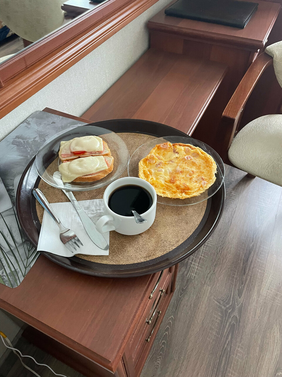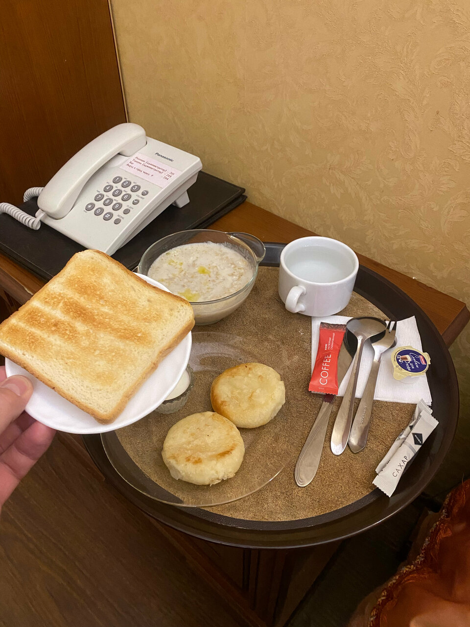Номер у нас был 2х комнатный люкс с сауной. Внутри все очень классно, номер очень понравился. Единственное, что плохо-это номер на 5м этаже и нет лифта. Завтрак каждый день надо заказывать и маленький набор, который входит в стоимость. Хочешь больше — плати. На завтрак — каша, тост и кофе маленькая чашка.
