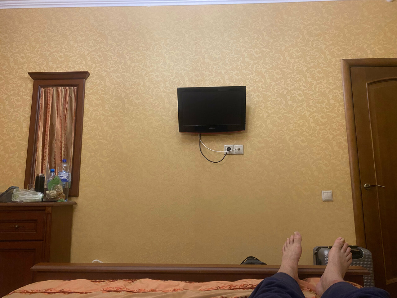 Номер простоный, всё есть, кроме тапочек. С уборкой тоже подкачали, особенно в ванной комнате. Сломано крепление лейки в душевой. Но есть и плюсы, завтрак вкусный, принесли в то время как и заказывали, прямо в номер. Вообще всё устроило, если не обращать на недочёты. Есть телевизор, много розеток.