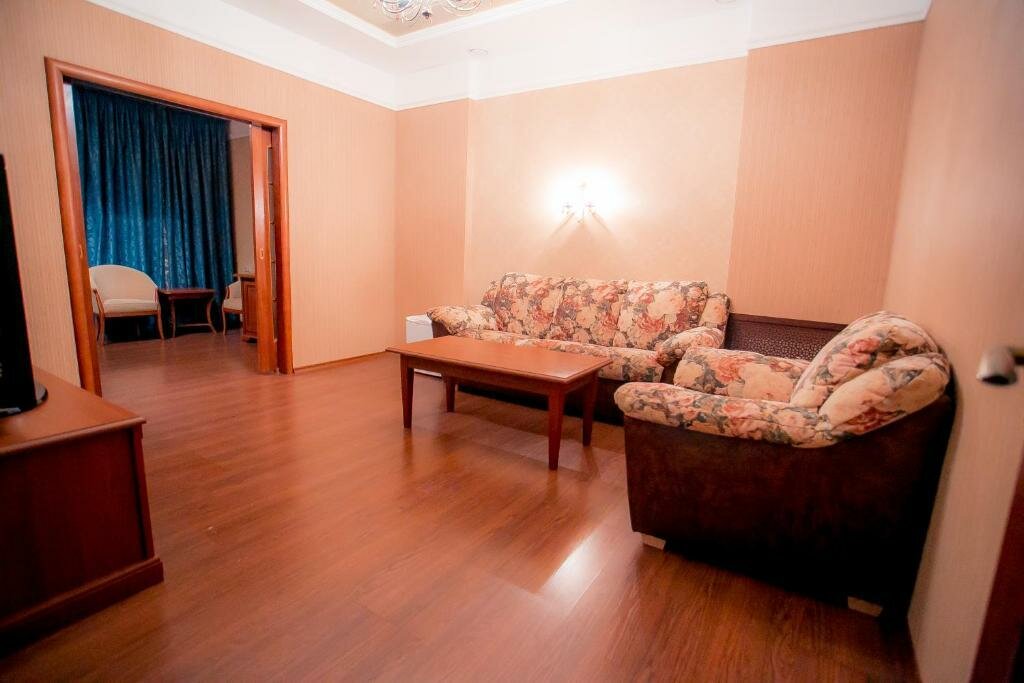 Не пугайтесь внешнего вида здания. Внутри все отлично. Завтрак принесли в номер. Девушка на ресепшн очень вежливая, внимательная. Большое спасибо за душевную встречу. Минус — диван в люксе плохо раскладывается и спать не очень удобно. Нужно Починить.