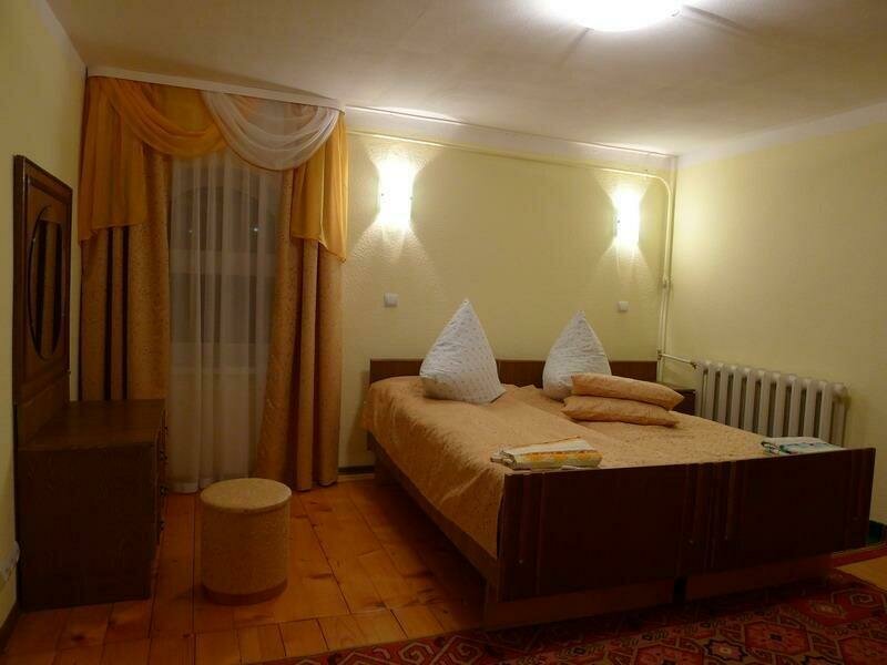 Уютный номер. Новая мебель, современный дизайн, комфорт и чистота в каждом номере. В номере большая двуспальная кровать, холодильник, телевизор, чайник, набор посуды.