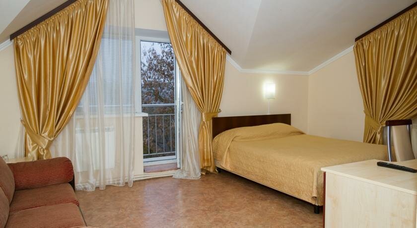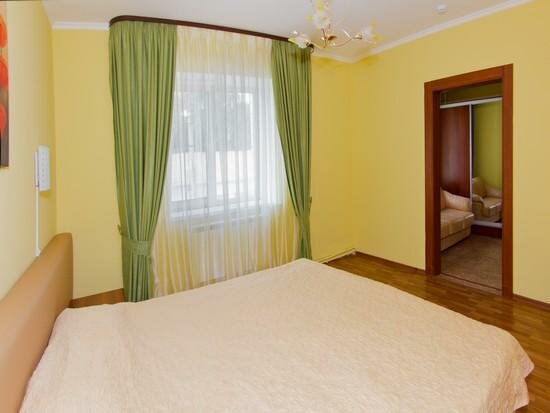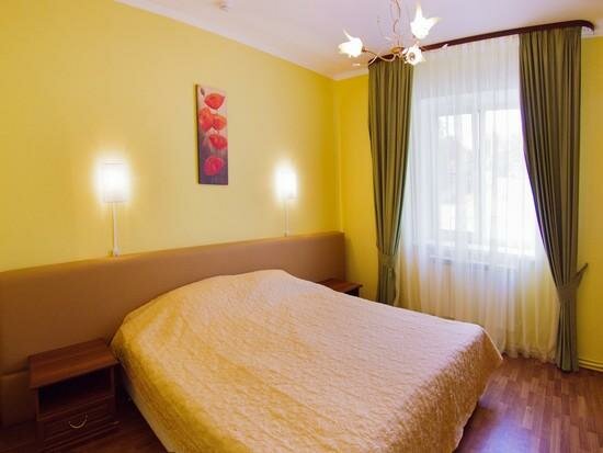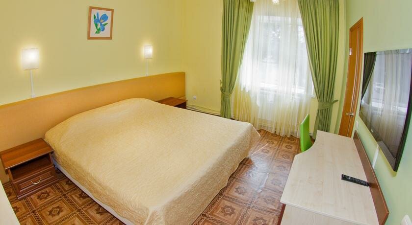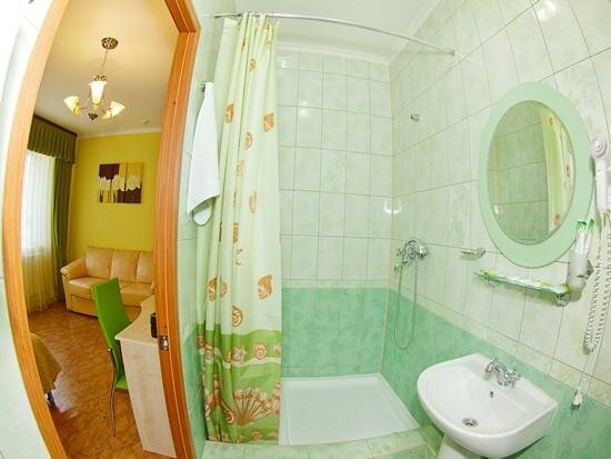 Гостиница удобно расположена, в пешей доступности центральный парк, набережная. Из минусов расположения то, что бы дойти в центр нужно идти на очень крутой подъём, зато обратно возвращаться хорошо. В гостинице снимали двухкомнатный (четырёхместный) полулюкс. Номер очень чистый. В номере две односпальные кровати и диван кровать. Диван кровать напоминает раскладушку поэтому спать очень удобно. В номере есть телевизор, два столика, холодильник, фен. Из минусов в номере расположен газовый котел, который шумит (мы снимали номер в начале марта и работало отопление, возможно летом этой проблемы нет). Не понравилось качество постельного белья, наволочки имеют порывы. На первом этаже есть кухня с микроволновой печью, посудой, чайником и куллером. На кухне два стола, каждый на четыре человека. Персонал в гостинице очень вежливый. Перед гостиницей есть парковка для автомобилей.