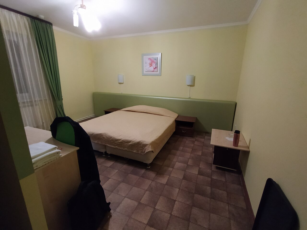 Номер хороший,просторный, телевизор большой, кровать чистая удобная и большая. За 1600 со своей ванной вообще отлично. Но располагается у подножия горы. Рядом ресторанов нет, надо подниматься)