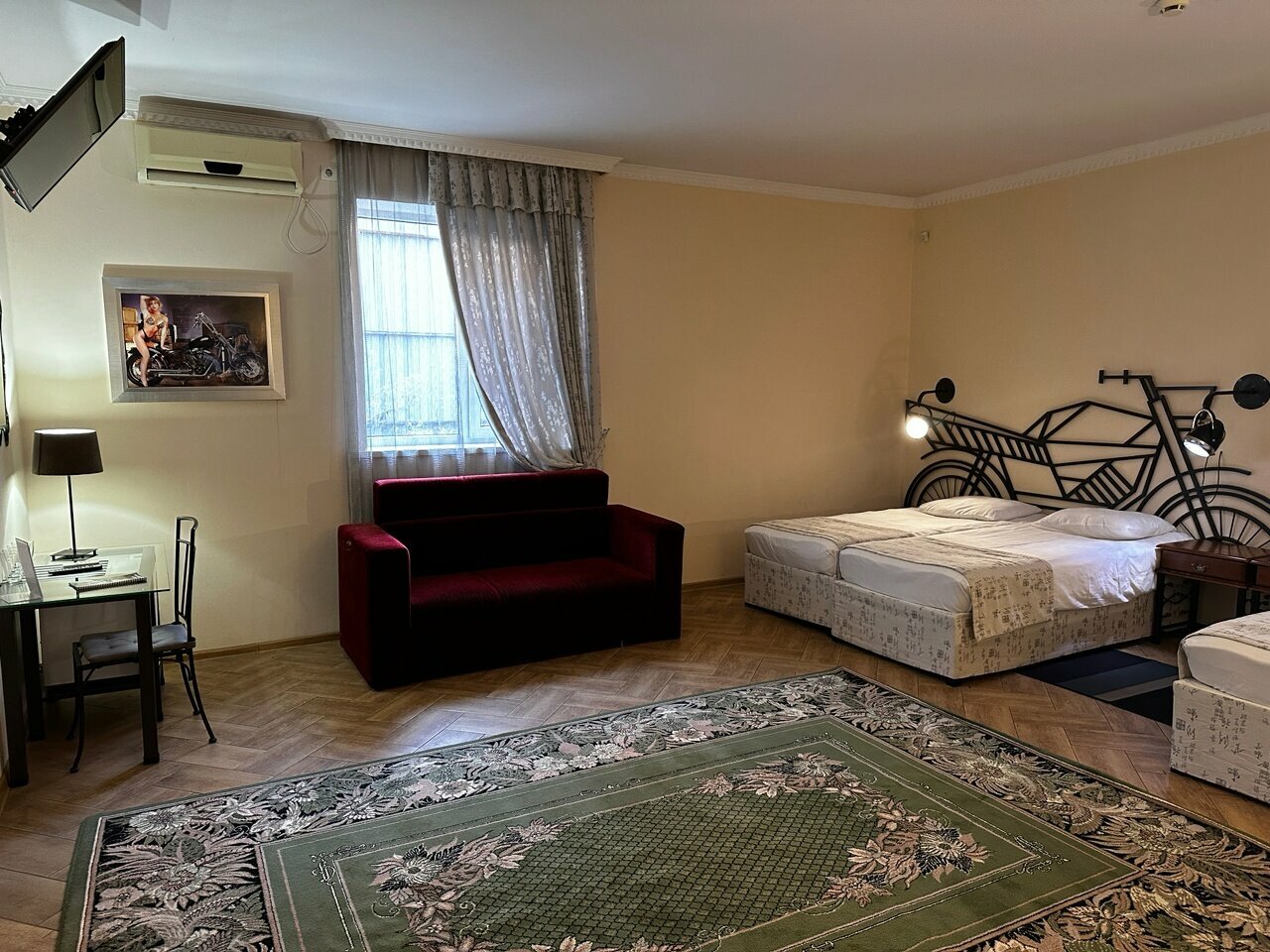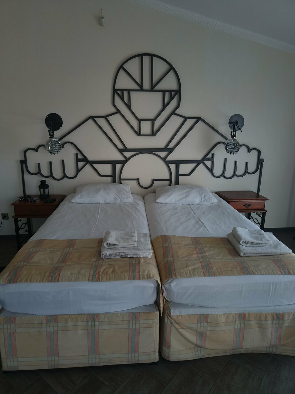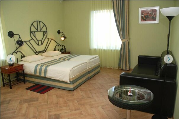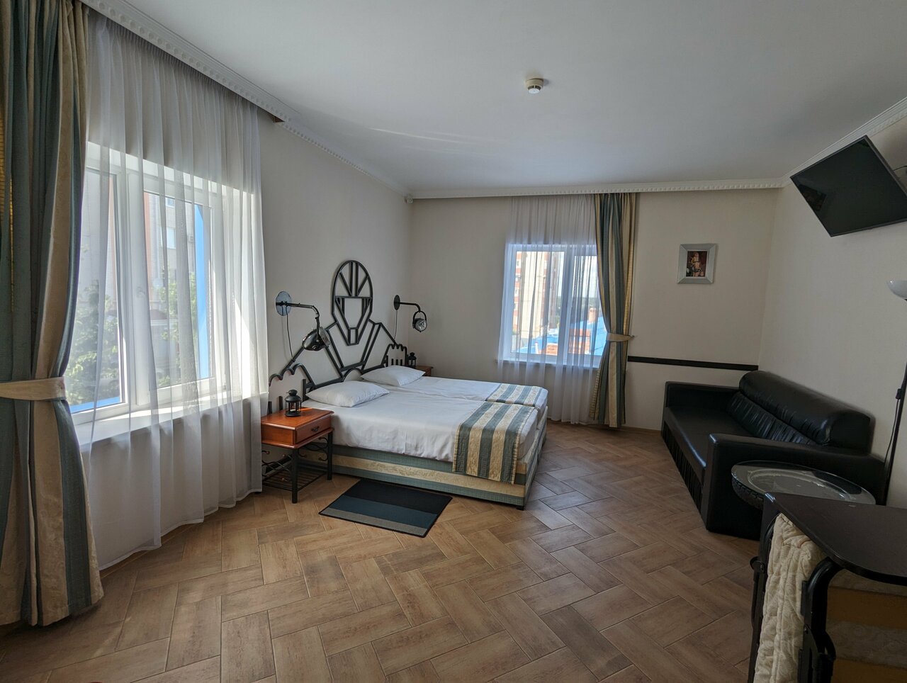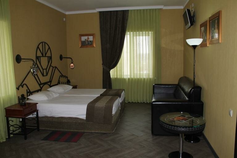 Достаточно интересный отель, атмосфера брутальная.в номере чисто, наш был на третьем этаже, большой с двуспальной кроватью , диваном и двумя креслами. Окна номера на двор соседнего дома , что лучше чем на трассу. Поместились в номере четвером . Поужинать толком не успели в баре к этому времени остались только макароны, хотя время было всего 10 вечера, кухня уже не принимала заказы — Аля карт, . Завтраки также проходили в столовой от отеля . Время начала завтраков с 8-10 утра немного поздновато для тех кто едет на море, раньше было с 7 утра что на мой взгляд комфортнее. Персонал внимательный, грамотно и вежливо отвечает на вопросы. В течении дня пока ехали по трассе немного задержались в пробках, — девушка с ресепшена отзвонилась нам уточнила время заезда , что было очень приятно.ночевали одну ночь, впечатления на твердую четверку о номере( запах канализации)персонал молодцы