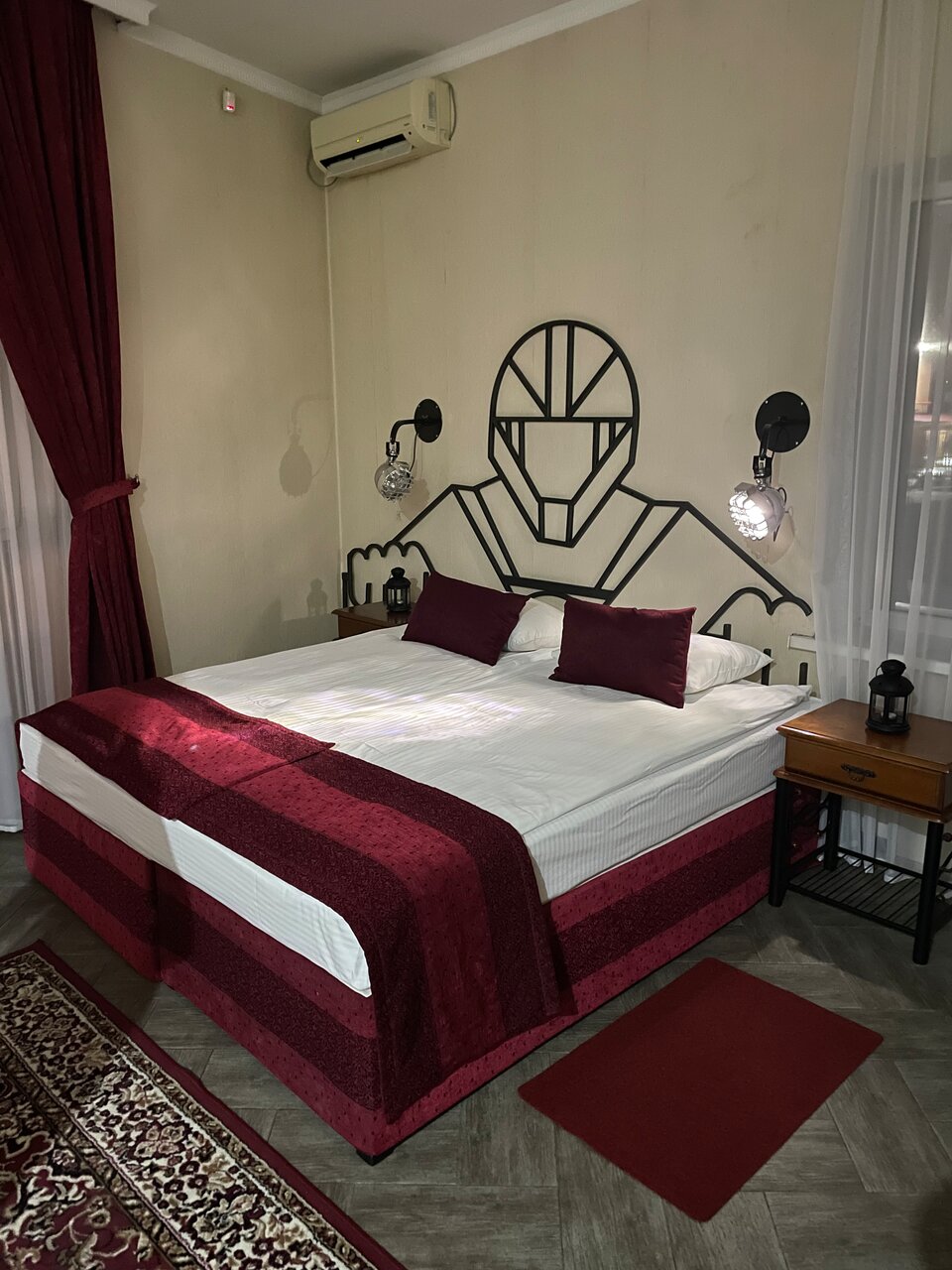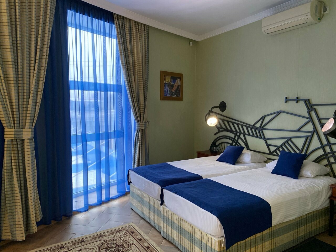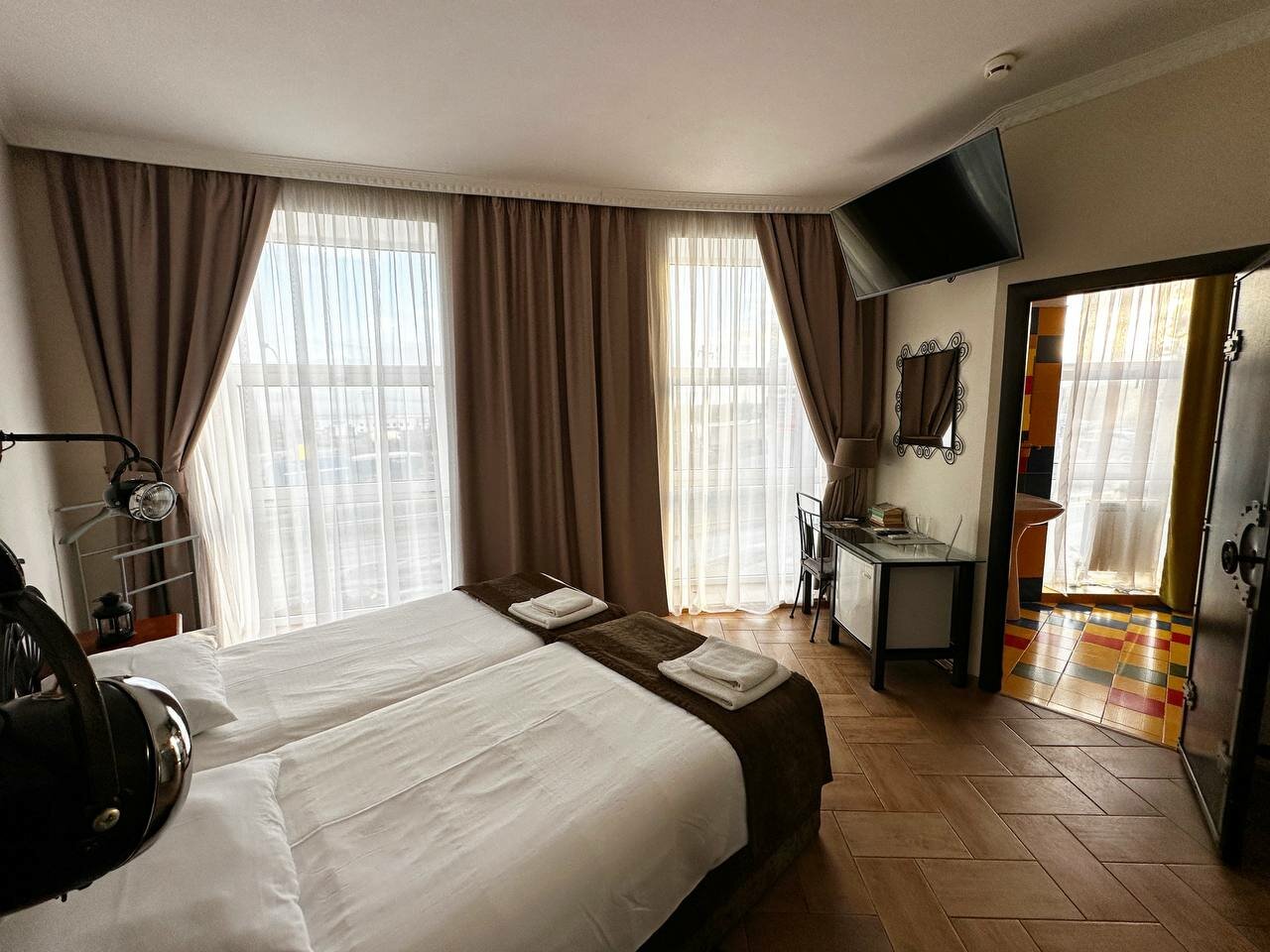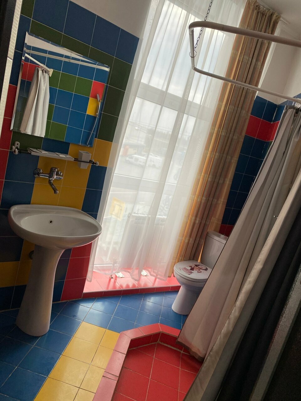 Достаточно интересный отель, атмосфера брутальная.в номере чисто, наш был на третьем этаже, большой с двуспальной кроватью , диваном и двумя креслами. Окна номера на двор соседнего дома , что лучше чем на трассу. Поместились в номере четвером . Поужинать толком не успели в баре к этому времени остались только макароны, хотя время было всего 10 вечера, кухня уже не принимала заказы — Аля карт, . Завтраки также проходили в столовой от отеля . Время начала завтраков с 8-10 утра немного поздновато для тех кто едет на море, раньше было с 7 утра что на мой взгляд комфортнее. Персонал внимательный, грамотно и вежливо отвечает на вопросы. В течении дня пока ехали по трассе немного задержались в пробках, — девушка с ресепшена отзвонилась нам уточнила время заезда , что было очень приятно.ночевали одну ночь, впечатления на твердую четверку о номере( запах канализации)персонал молодцы