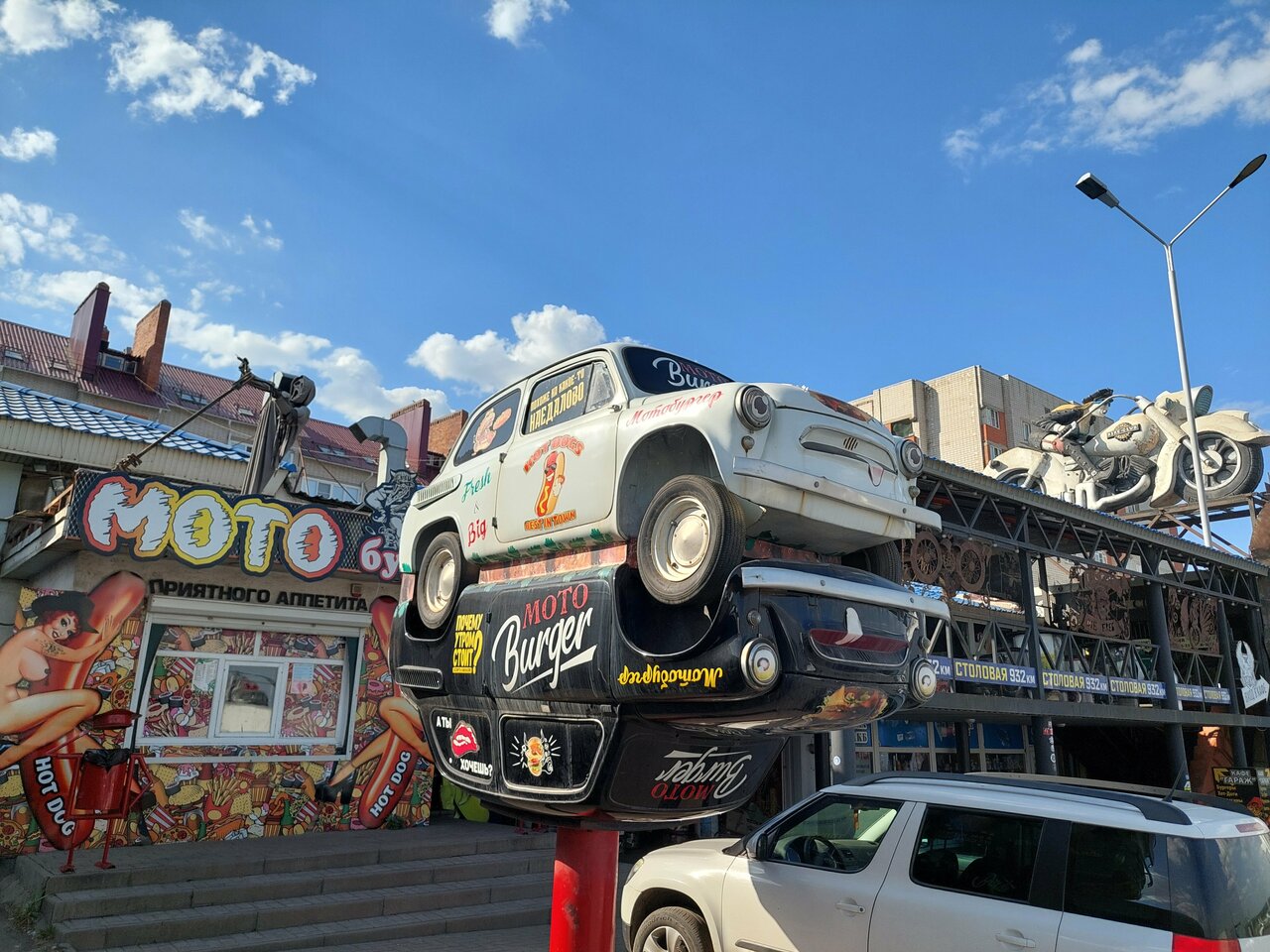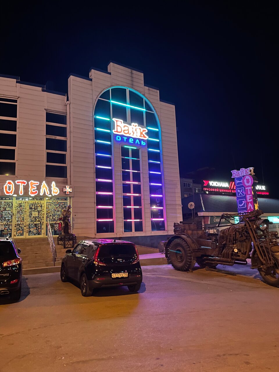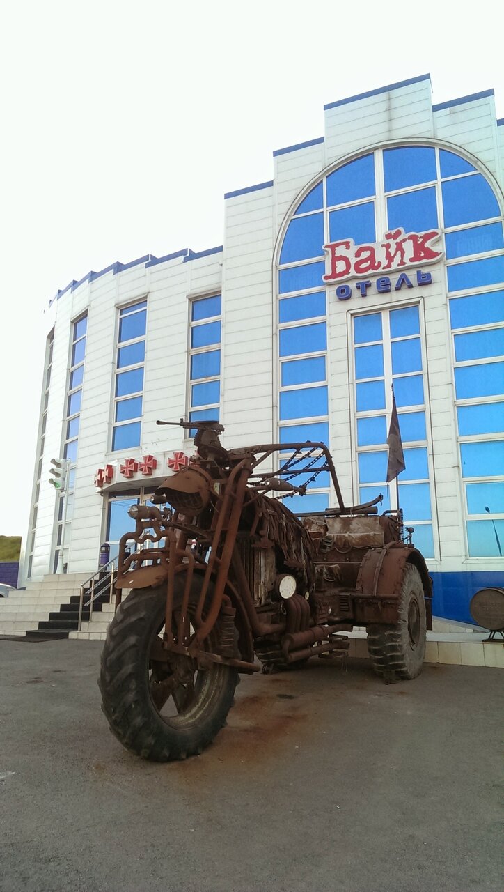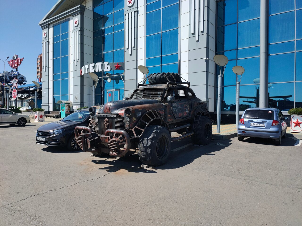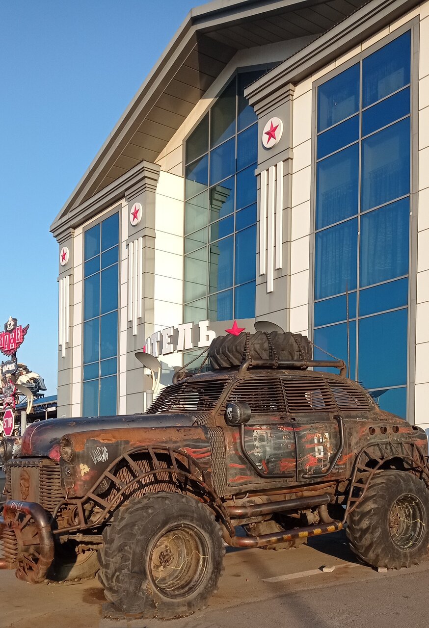 Остановились здесь, потому что ехали с ребенком — ему был интересен весь этот байковский антураж ( по машинам полазить, на мотоциклах посидеть), к тому же напротив отеля парк Патриот — тоже сходили. Рядом автокафе — вместо обычных столиков машинки, можно вполне прилично поужинать. Номер на ночь лучше бронировать заранее, мы позвонили часа за 2, когда добрались, свободных уже не было