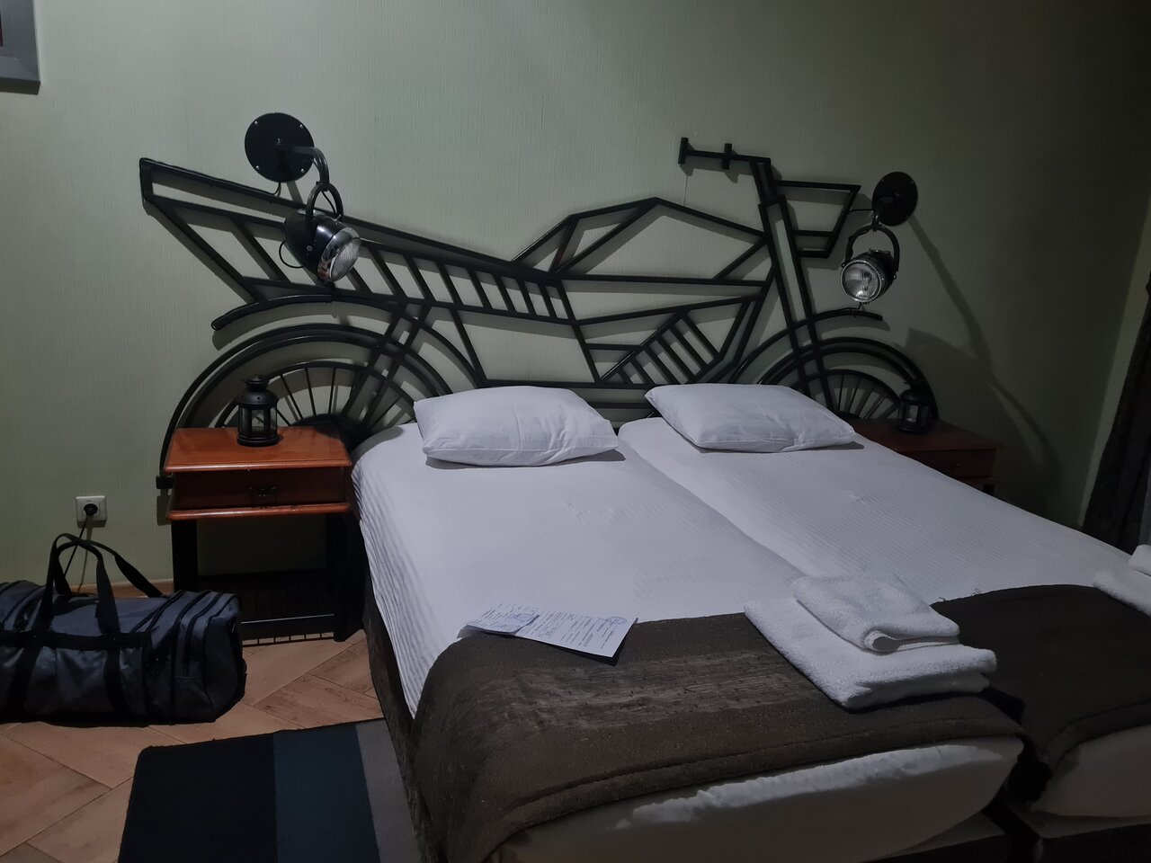 Гостиница приятная, комфортная. Было 4 человека (2 взр., 2 детей) в трехместном номере нормально разместились, за доп. Плату дали раскладную кровать. Хороший сан. узел. Номер в байкерской тематике. А вот общепит подкачал. За дизайн 5, еда на 2+, обслуживание 3+. Картой не расплатиться, пришлось ехать искать банкомат