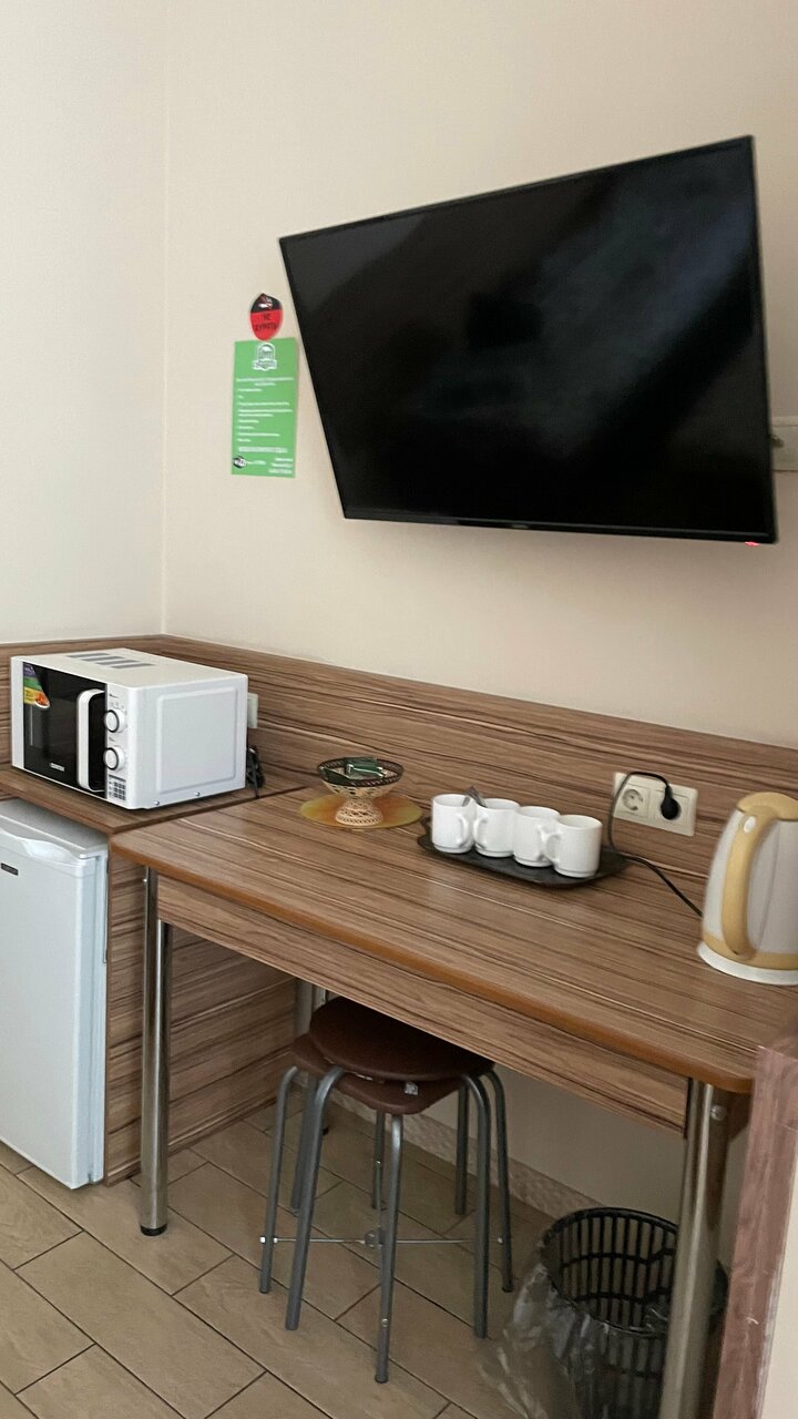 Очень чисто, все работает, в номере холодильник, чайник, микроволновка, в коридоре вода из кулера. Номер на 5х очень удобный.