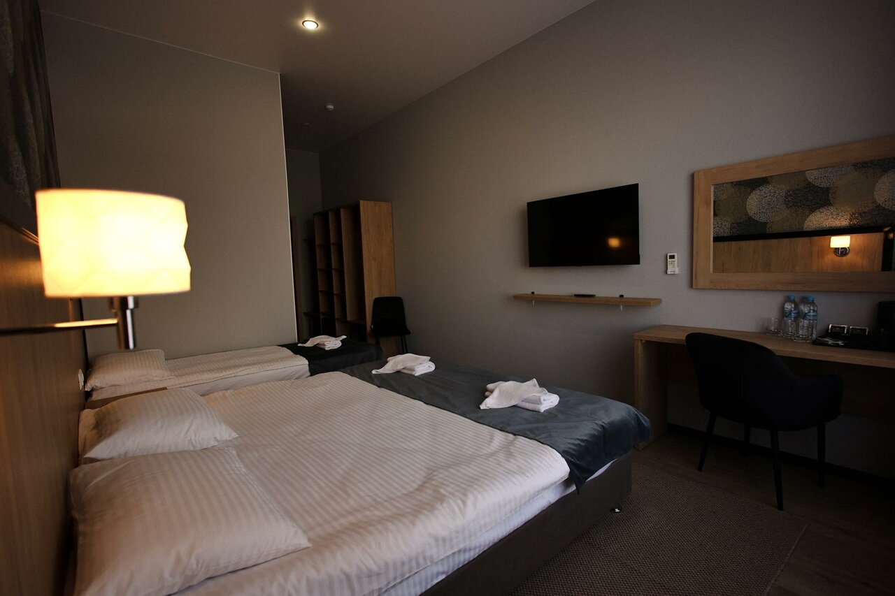 Отличная гостиница, номера в современном стиле, чисто и аккуратно. Все новое. Обслуживание хорошее, персонал вежливый. В номере большой телевизор. Двухспальная кровать с хорошим матрасом и подушками, высыпаться одно удовольствие. Полный комплект гигиенических пренодлежностей (шампунь,мыло, гель, зубные щетки и паста) . Гостиница находится на съезде с трассы, удобно для путешественников. Из минусов разве, что отсутствие питания, потому что своего кафе или ресторана у гостиницы нет