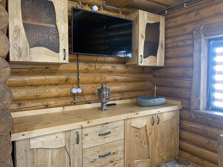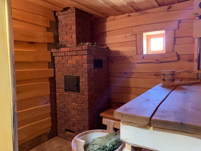 Расскажу про левую половину (потому что баня там не одна): Отличная сауна! Приветливый и добрый хозяин! Интерьер ‘дорого-богато из сруба’, как положено! Чисто, удобно. Из банных приспособлений — механизм для опрокидывания холодной воды на голову. Бассейна нет. Есть подогреваемый (на улице) чан. Про душ и туалет молчу, он по умолчанию должен быть и тут он также неплох. Второй этаж также удобен, есть как кровать, так и диван. Для детишек там самое место (второй этаж) — их привлечет как телевизор с мультиками, так и сама лестница (для самых маленьких может выглядеть опасно). Можно курить кальян, что удивило! Это огромный плюс! На участке продаются разные соленья, мёд. Нам понравилось!