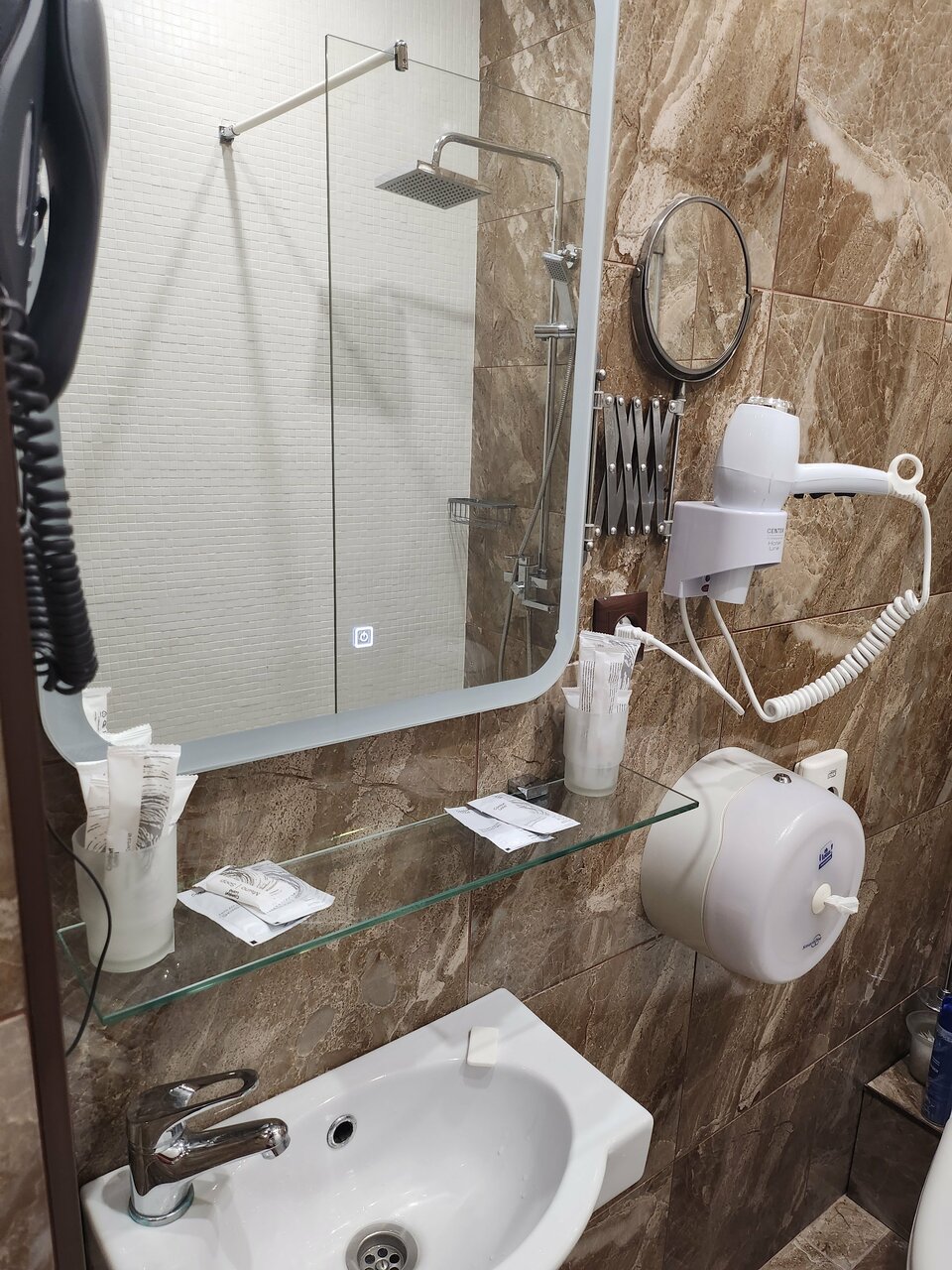 И , вроде бы, неплохой отель, но и отличным не назову. Может так с номером не повезло. Всё чисто, хорошо, на ресепшен милые девушки. В номере все есть ( тапочки, халат, ванные принадлежности, бритва. что редко для такого уровня отеля) . Но есть и минусы. 1. Душевая кабинка совсем маленькая. Полному человеку совсем тяжело будет. 2. Телевизор тоже малюсенький. У меня на кухне больше. Но это кто любит смотреть. Об отеле. Завтрак шведский стол, но выбор совсем небольшой. Кофе растворимый. За деньги- из кофемашины. 4- ре этажа и без лифта. Кому критично. Парковка небольшая. А так, как промежуточный пункт, где можно хорошо переночевать. то неплохо даже.