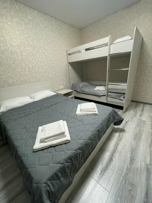 Шикарный семейный двухкомнатный номер, оснащен двумя двухспальными кроватями и большим диваном,(по вашему запросу поставим детскую кроватку 500р), холодильник,полотенца, душ, кондиционер, бесплатный wifi, парковка, видеонаблюдение.