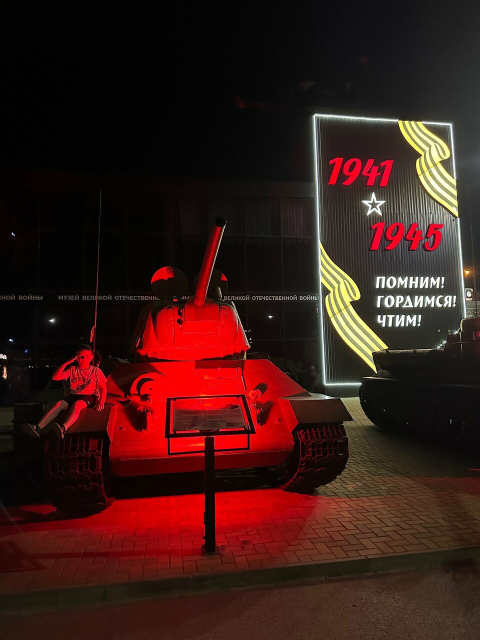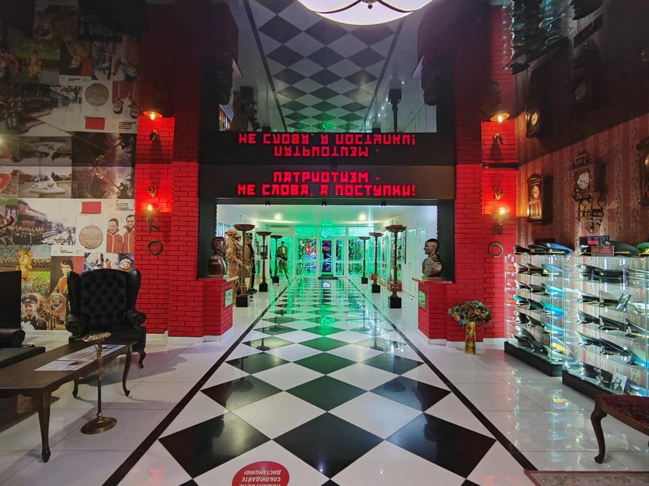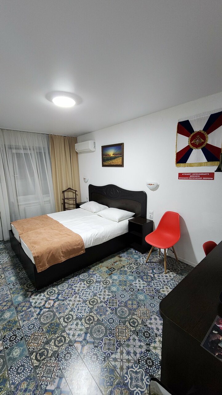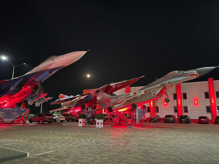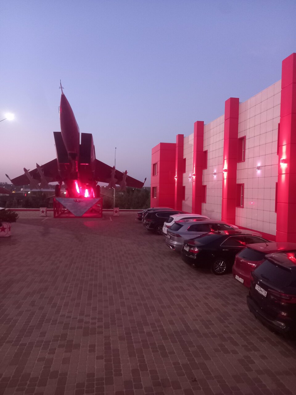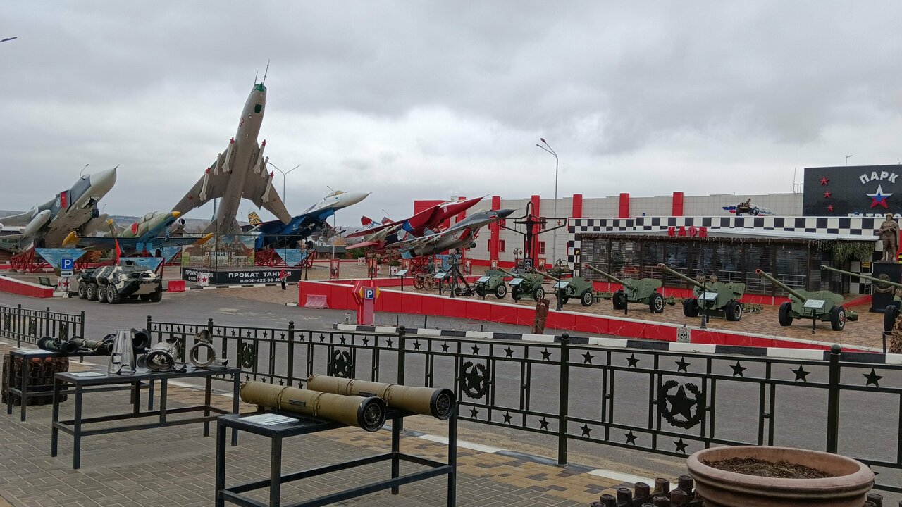 Это место вы не забудете никогда! Очень атмосферный отель! Масштаб музея военной техники впечатлил! Сам отель имеет большое количество интересных фотозон. Есть кафе на 1 этаже, кулер. Большой номер со всем необходимым: холодильник, кондиционер, тв. Чистота, что не может не радовать! Отель находится около трассы и это очень удобно для путешественников.