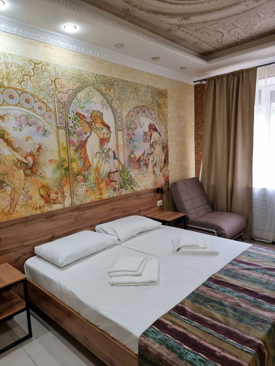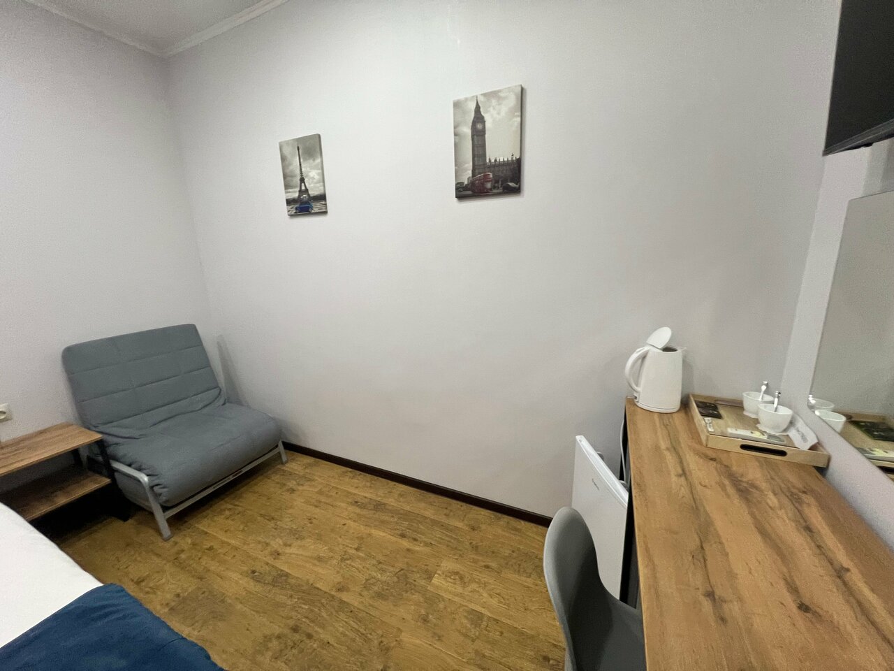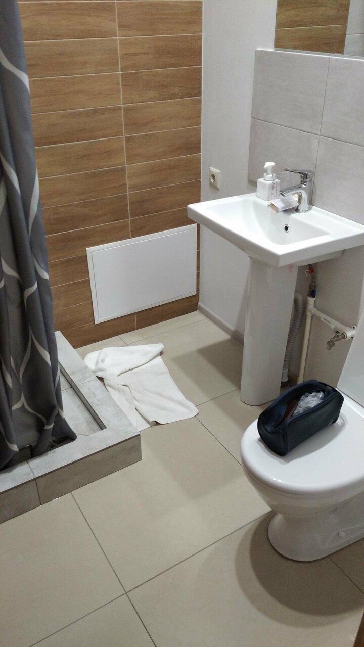 - Холодная плитка в номере (нет прикроватных ковриков).