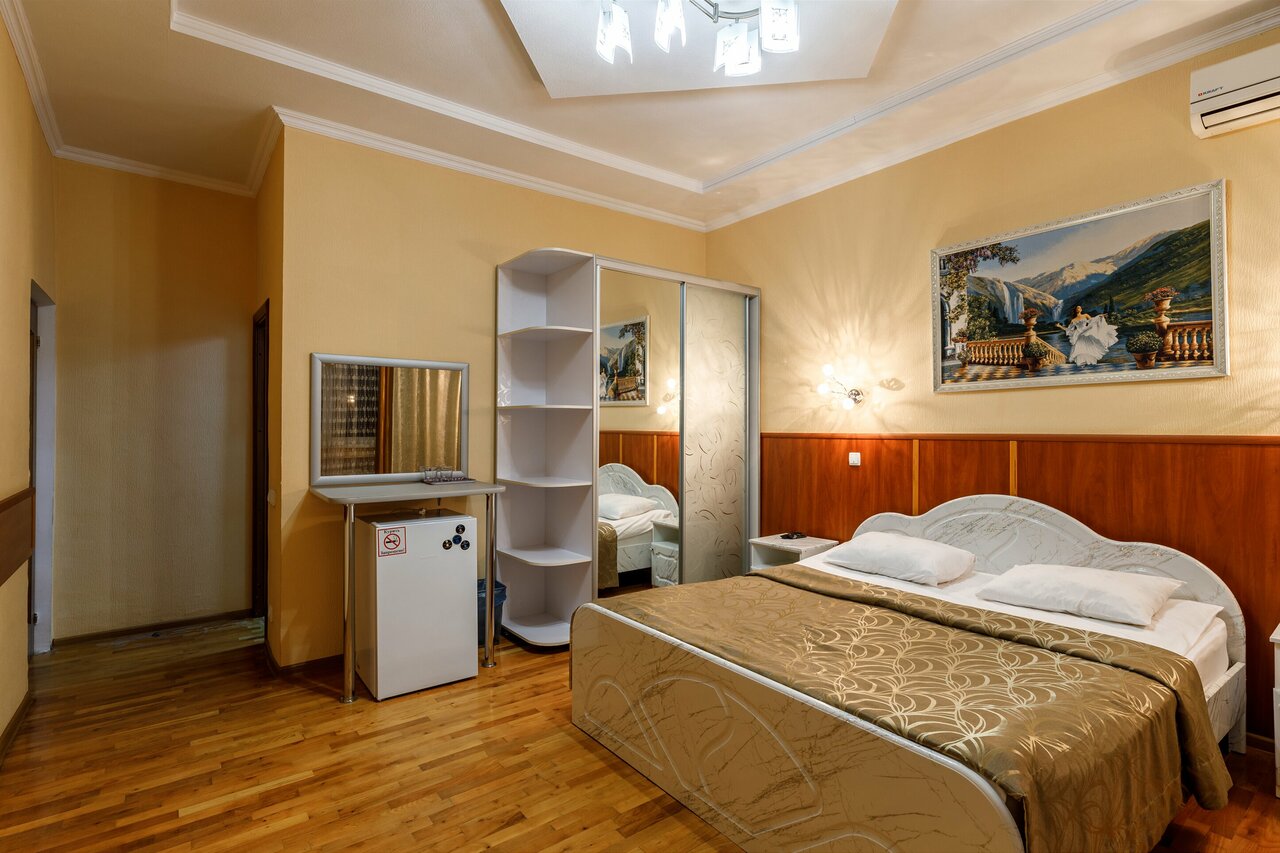 Одна большая кровать;Ванная комната;Телевизор;Спутниковое телевидение;Wi-Fi;Холодильник;Стол для полноценной работы вкомандировке;Завтрак - 550 руб.;