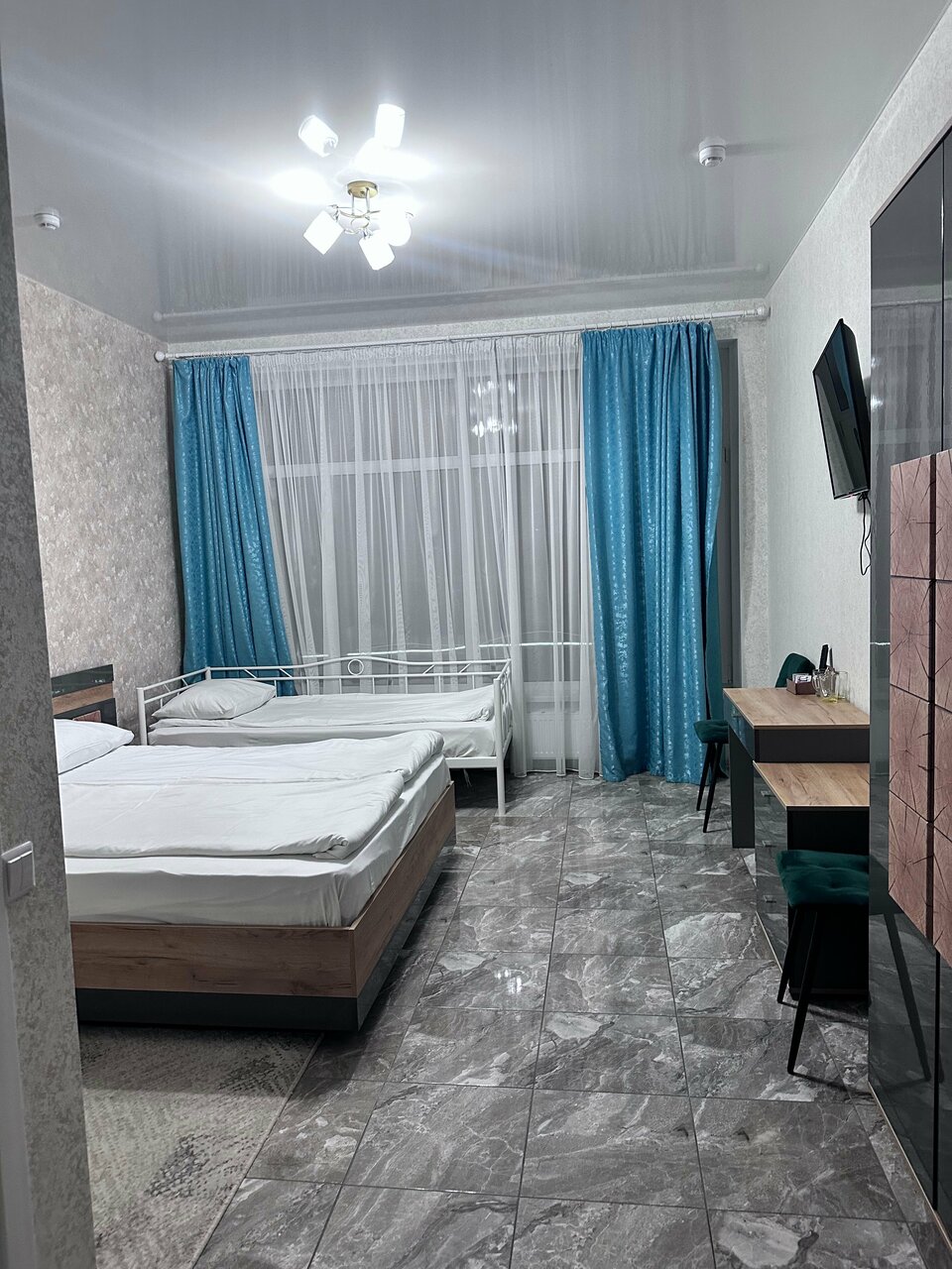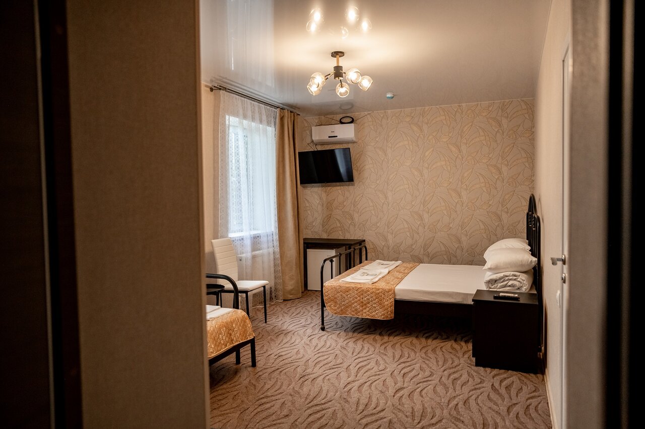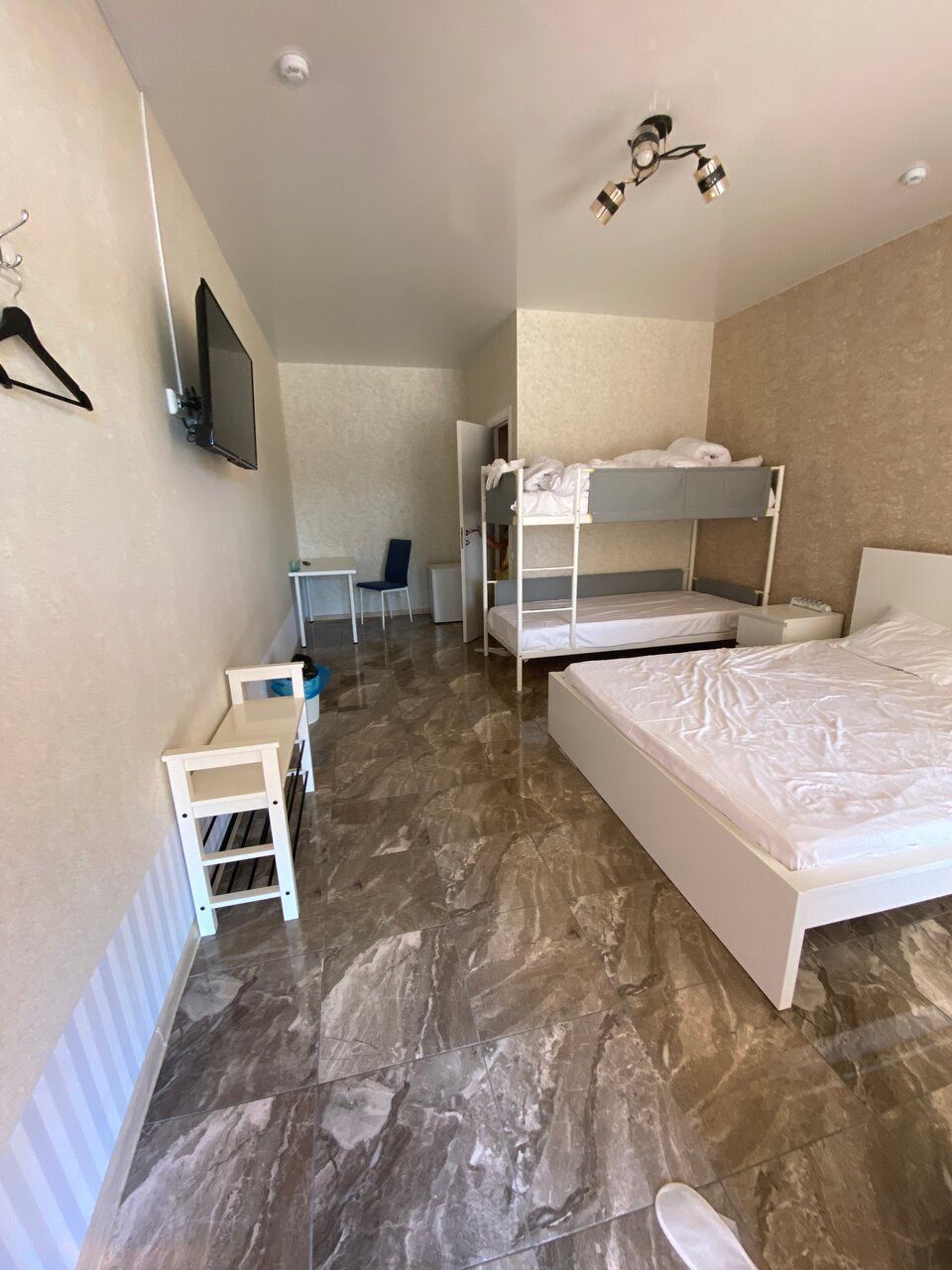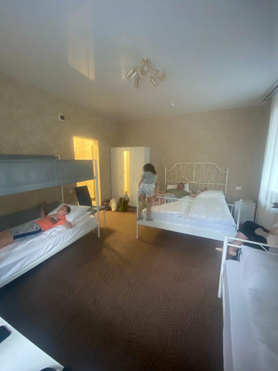По пути на море остановились на ночлег. Трёхместный номер на первом этаже с отдельным выходом на улицу. Все очень понравилось! Чисто, есть холодильник с морозилкой. Постельное чистое, кровати удобные. В отзывах писали, что кондиционер дует на кровать, у нас же он висел над входной дверью, а кровати были за стеной. Никому ничего не дуло, было очень комфортно. Так что нареканий нет. Спасибо! С удовольствием вернёмся.