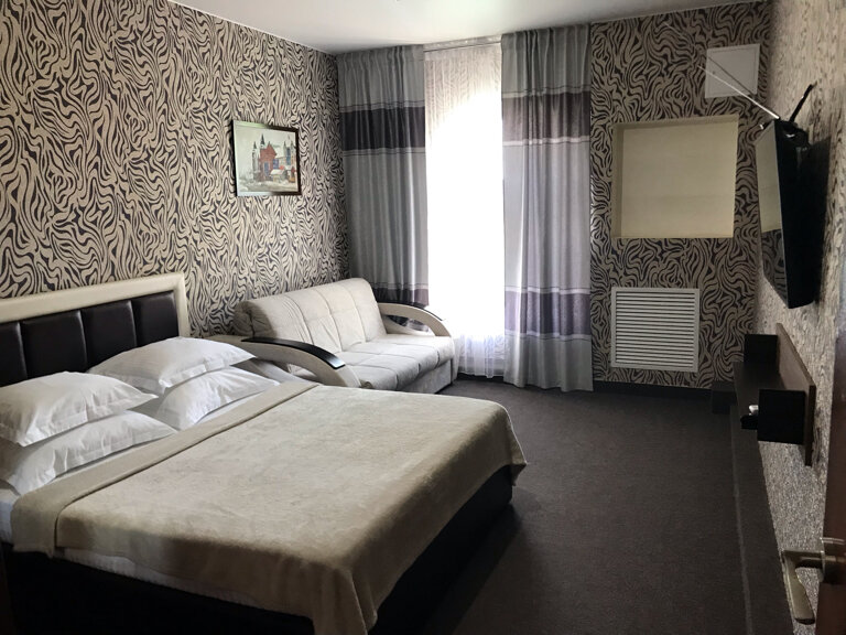 Уютный номер с большой двуспальной кроватью и доп.местом (диван). В номере есть сейф, телевизор,холодильник,кондиционер, халат,санузел с феном и гигиеническими принадлежностями. Доп.место +500 руб.