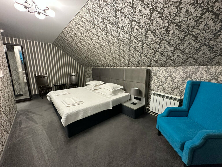 Уютный номер,с большой двуспальной кроватью. В номерах есть сейф, телевизор,холодильник,кондиционер, полотенцесушитель, халат,индивидуальный санузел с феном и гигиеническими принадлежностями.