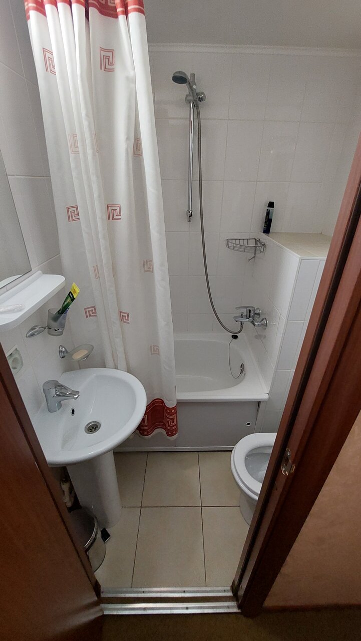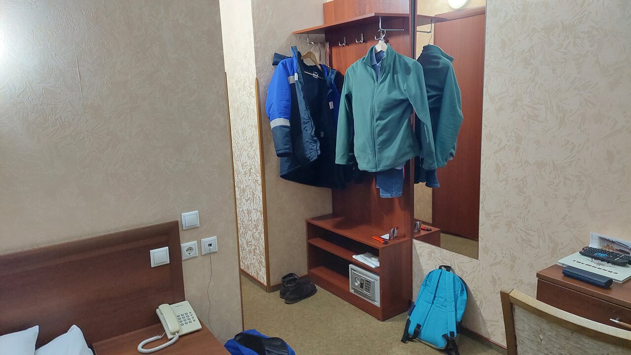 В номере темно. Светильники едва светят. Вечером за компьютером не поработаешь поскольку клавиатуру плохо видно в темноте. Ещё минус — отсутствие простого шкафа в номере. Вещи выложить из чемодана некуда