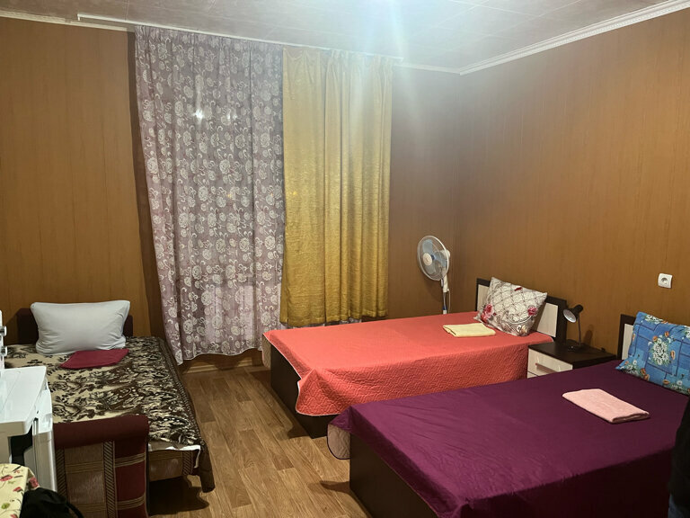 Ехали с семьёй с моря, остановились на ночлег. Было уже темно, не сразу нашли дом, но хозяин очень внимательный и гостеприимный, встретил вышел нас на улицу. Номер на втором этаже, туалет и душевая рядом с номером. Все очень аккуратно, чисто как дома. В номере уютно. Есть телевизор, холодильник, микроволновка, чайник, посуда, вентилятор. Постельное белье чистое. Полотенца конечно старенькие, неплохо бы заменить. Для ночлега на одну,две ночи очень не плохой вариант. Хорошо выспались, отдохнули.