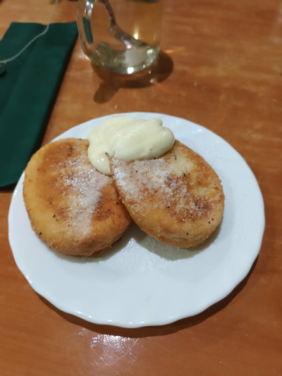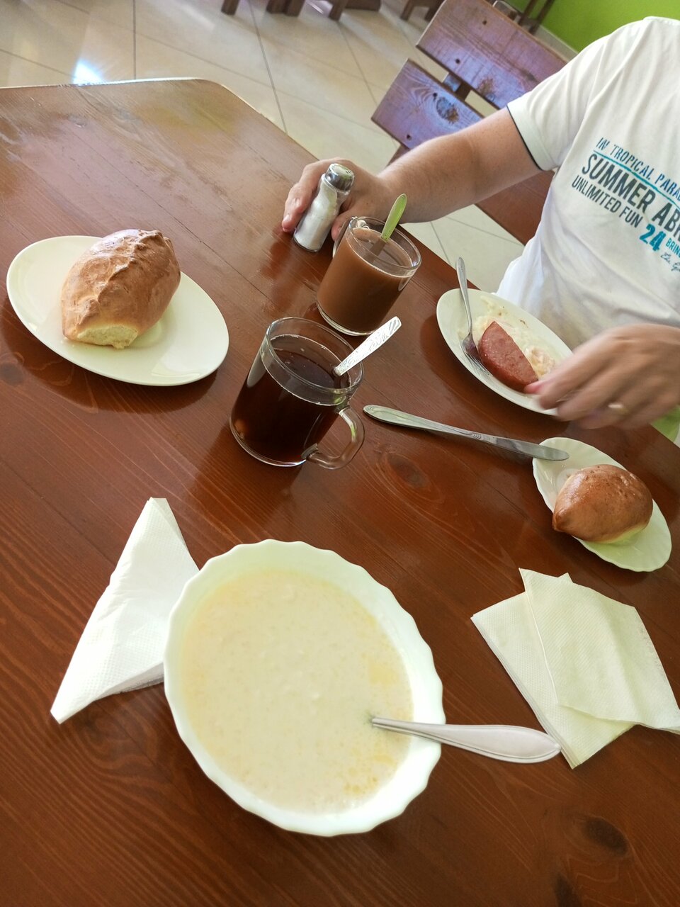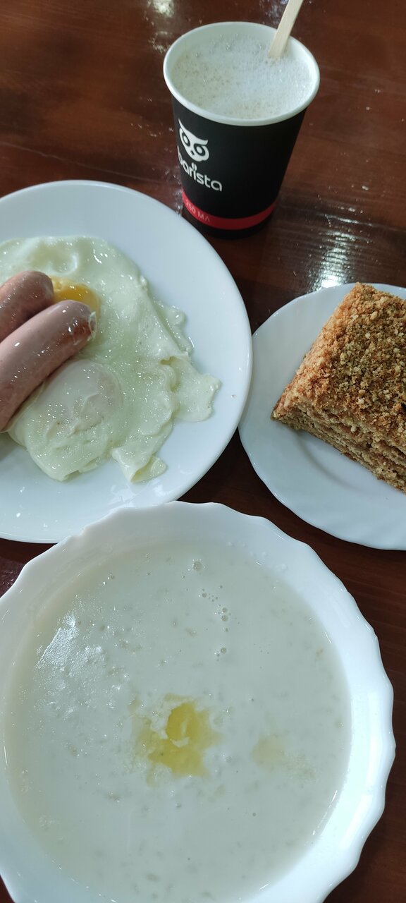 Подробный отзыв про кафе:) Во-первых, расположение столов. Столы огромные(на один поместятся человек так 8) и их мало. За одним столом сидите вы двое после тяжелой дороги,хотите поболтать,обсудить что-нибудь,но вас постоянно беспокоят вопросами у вас свободно? можно ли подсесть? Во-вторых,еда. Заказывала пюре с котлеткой,принесли пюре с волосней.Ладно,отнеслась к этому нормально(ну,с кем не бывает).Попросила поменять эту порциюпринесли ту же тарелку с той же порцией,только без волоса официант сказал,что порцию заменили Цены низкие,качество само собой не будет высокое Одноразовых приборов нет 1 звездочку ставлю только за бесподобную сосиску в тесте,как в школе!!!