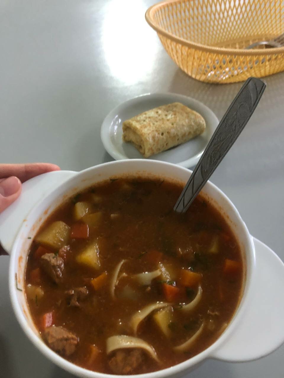Прежде,чем заказать к первому второе или компот-подумайте,порции просто огромные!Кое-как влезает 1 блюдо,остальное-хоть в карман складывается.Заведение частенько,приятное,лично мне понравилось,вкусно.