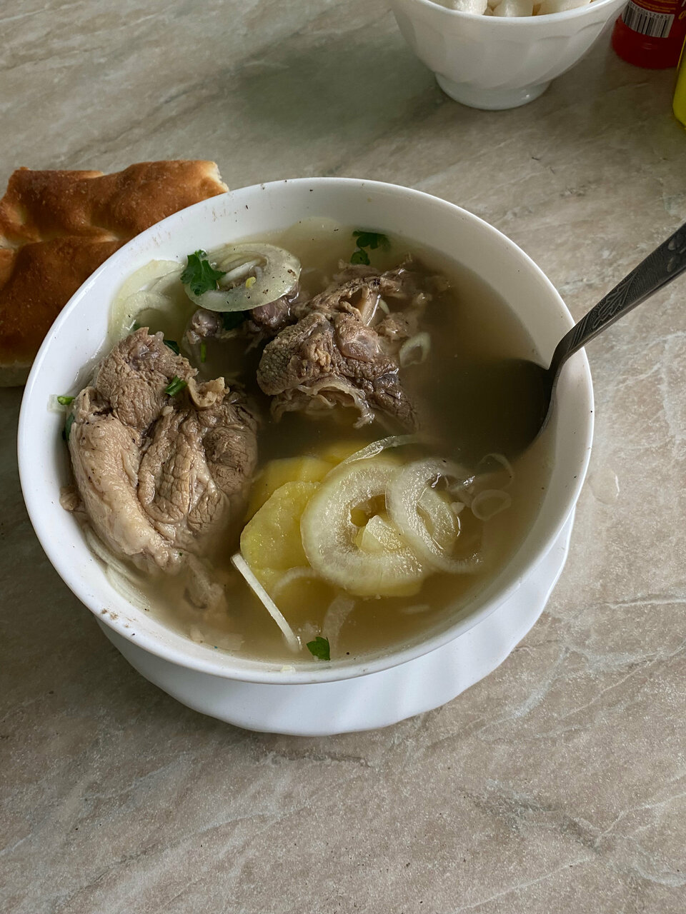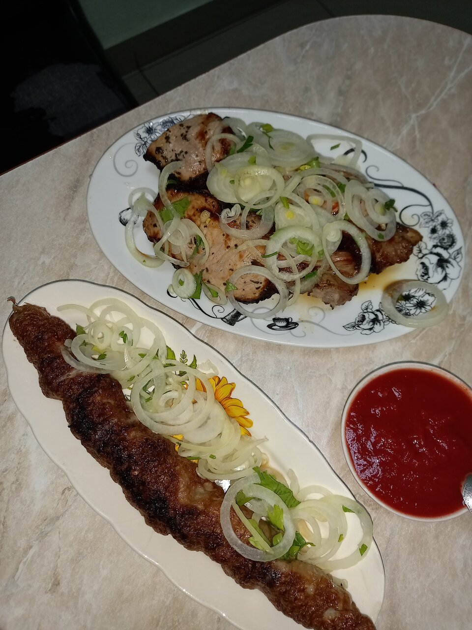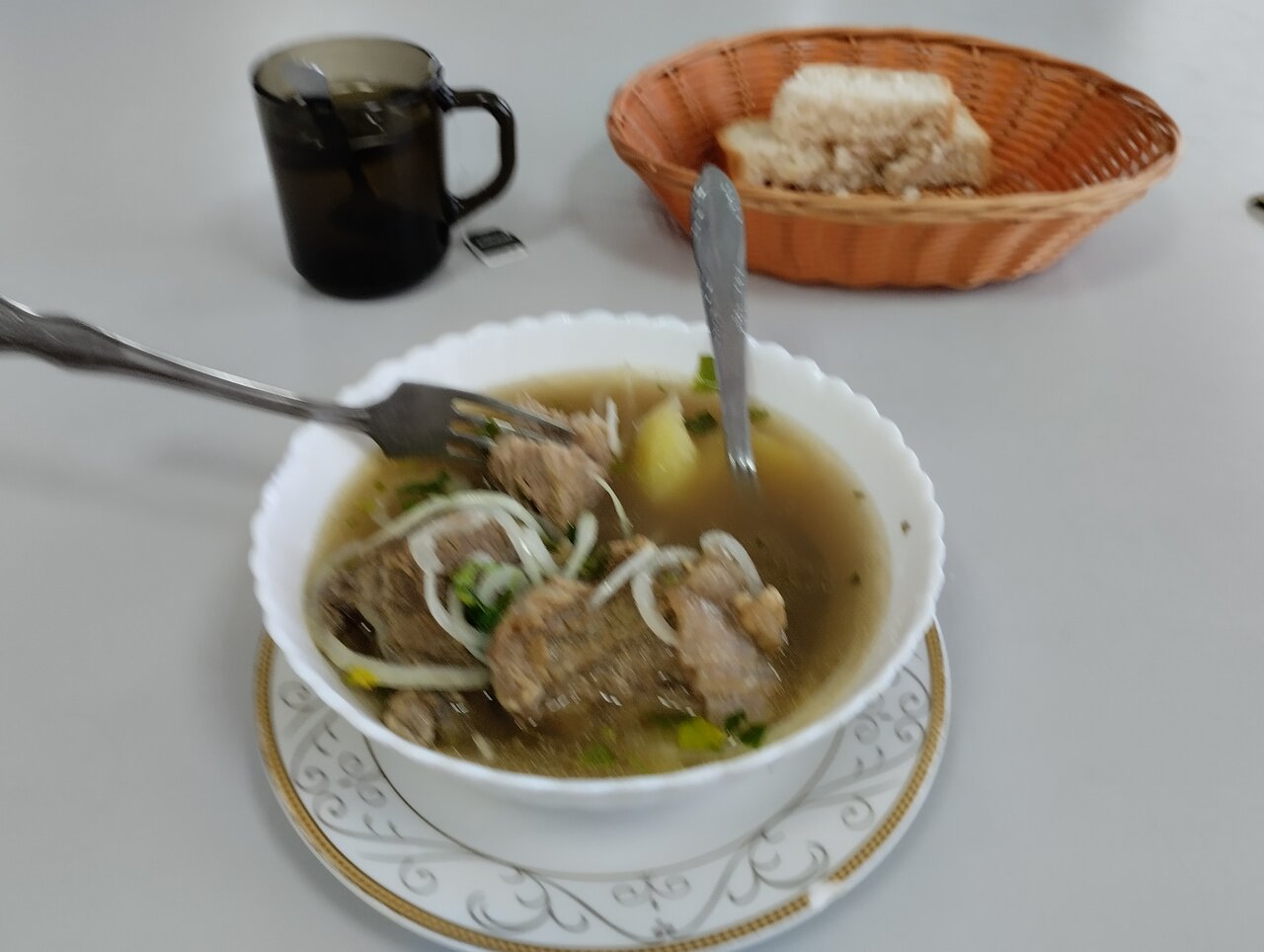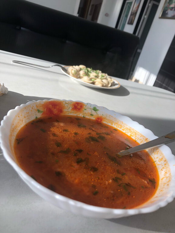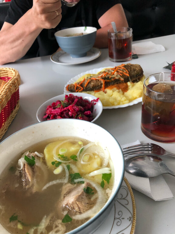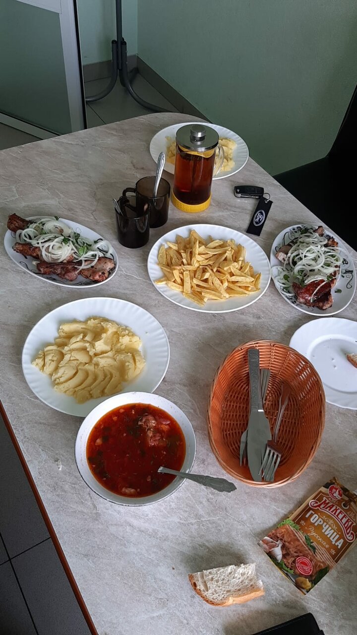 Порции огромные! Заказали на четверых (2 взрослых и 2 детей) окрошку на кефире, хашламу из баранины, плов из говядины, картофель фри, 2 чая, 2 компота, 1 лепёшку армянскую. Осталось полпорции окрошки, 2/3 лепешки и вся порция картофеля фри (он оказался не вкусный). В итоге заплатили 940 руб,но наелись до отвала