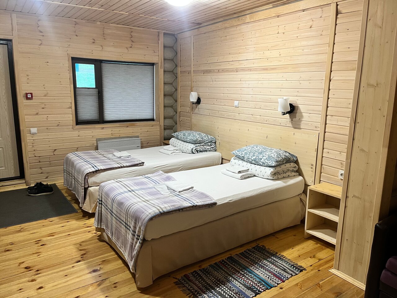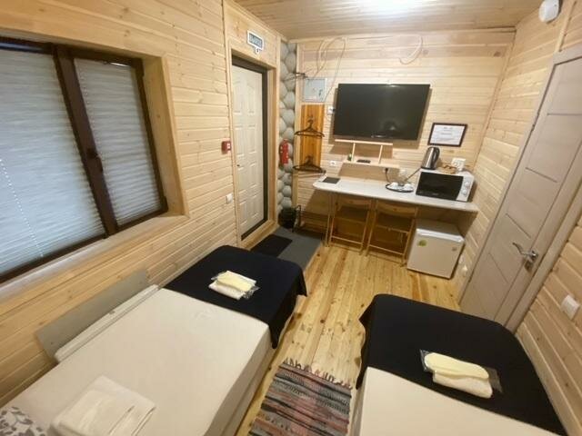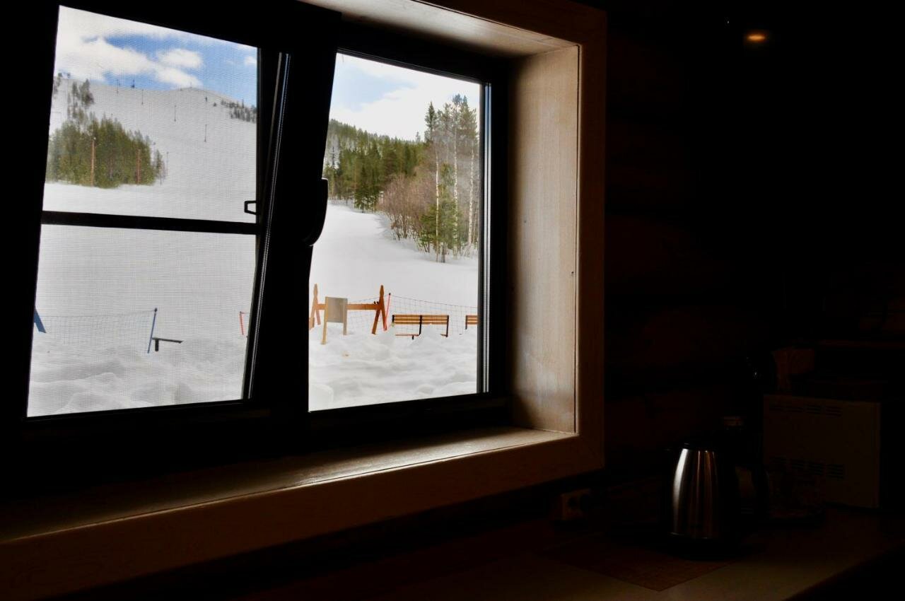 В номерах по скандинавски просто, чисто и комфортно. Есть хорошая баня/сауна. Прямо от гостиницы идёт бугельный подъемник на гору и снегоходная трасса. Есть простенькая кафешка. Минус в отсутствии кухни: приходится или заказывать доставку еды или ехать в город.