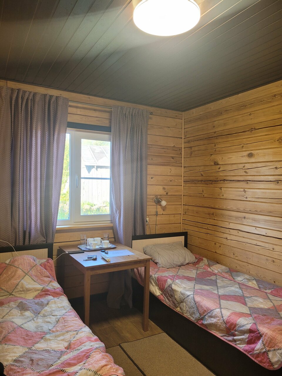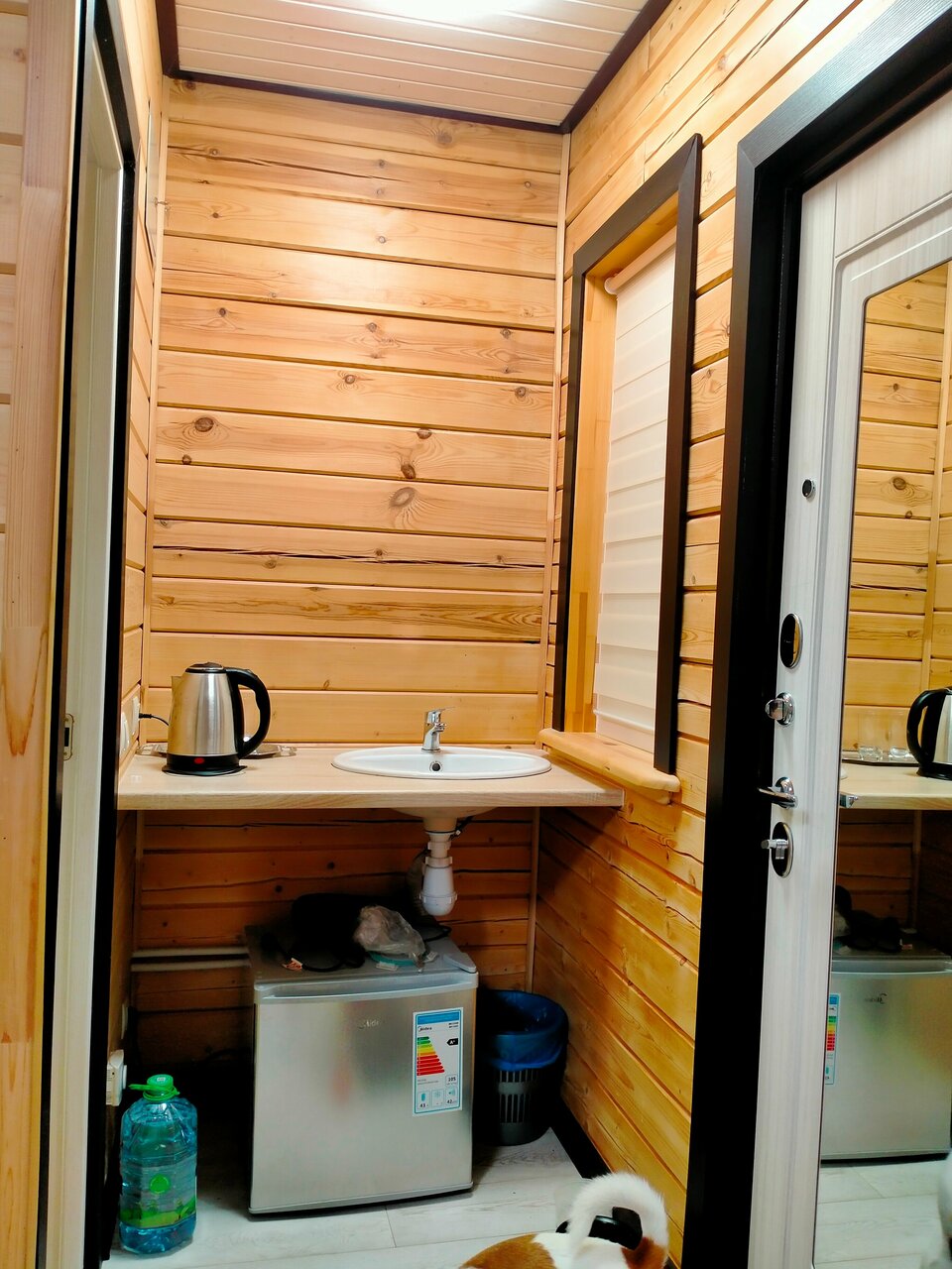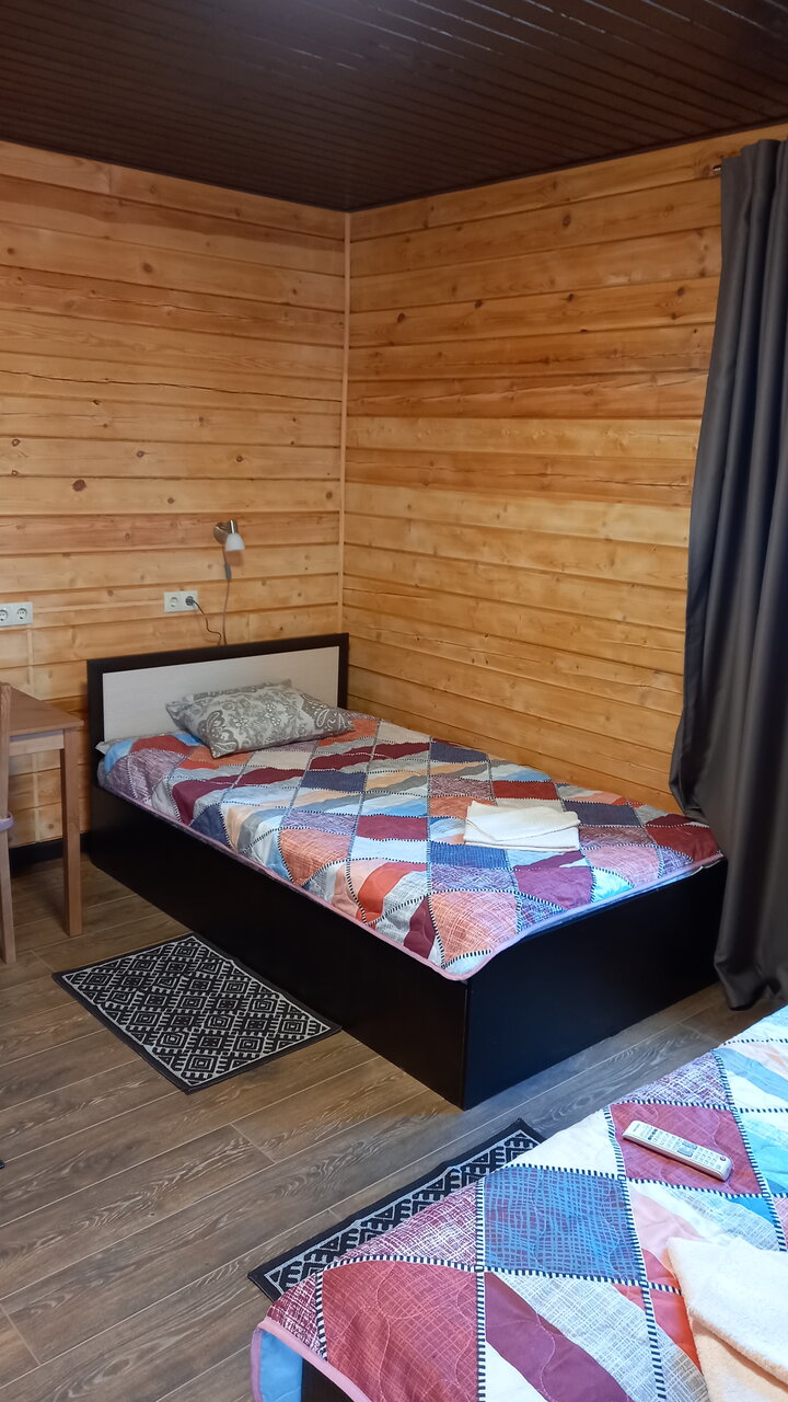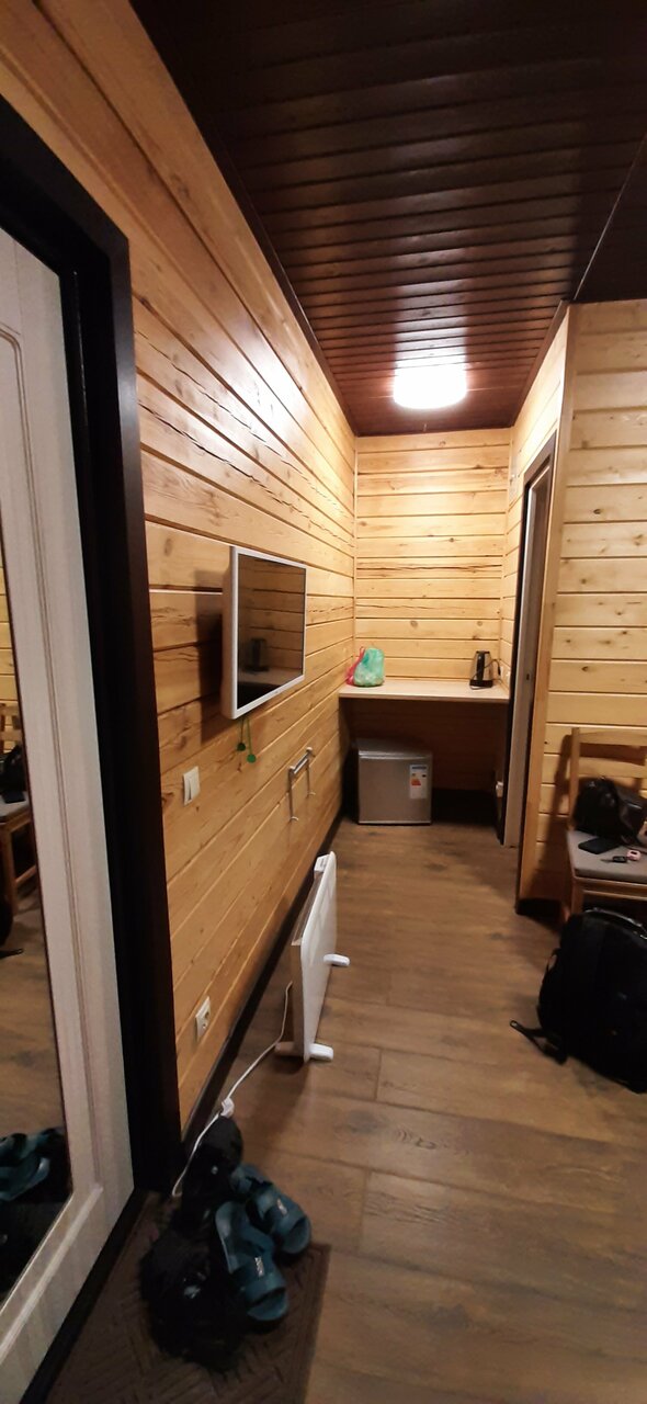 Отдыхали в трехместном номере. Номер стандартный без излишеств, все нужное присутствует, тепло. Общая кухня где можно приготовить покушать, холодильник, микроволновка, плита, фильтр на воду, диван, телевизор. Есть душ, совмещённый с туалетом и в другом конце коридора еще один туалет. Есть стиральная машинка. Мы заказывали ужин в столовой при гостинице — карельский лосось- порция огромная очень вкусно и сытно, ходили в баню (на фото)- чисто и уютно, есть пирс — для купания в Белом море после баньки. Очень приятное чистое и спокойное место.