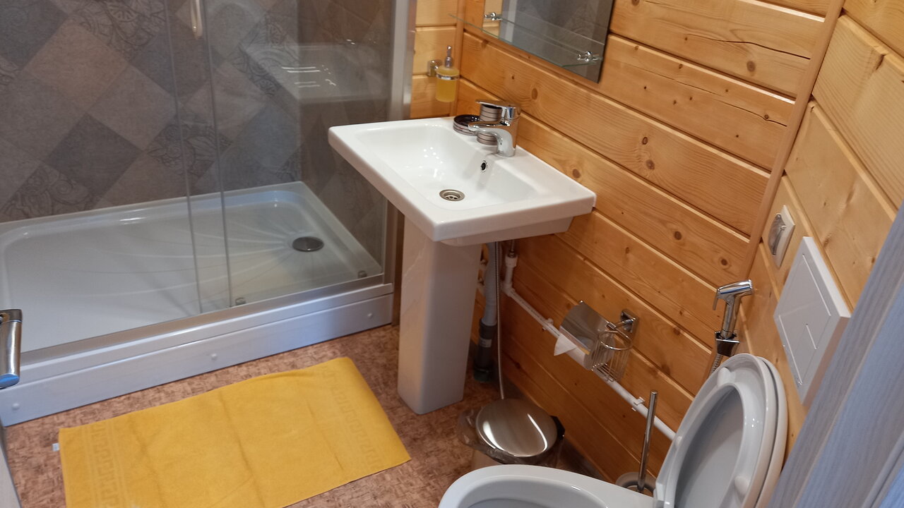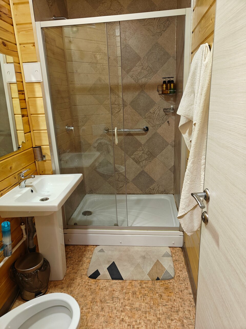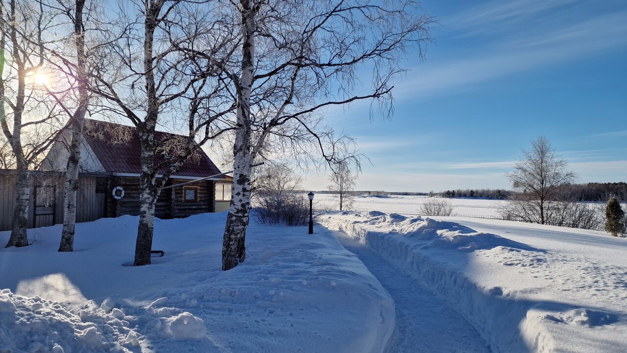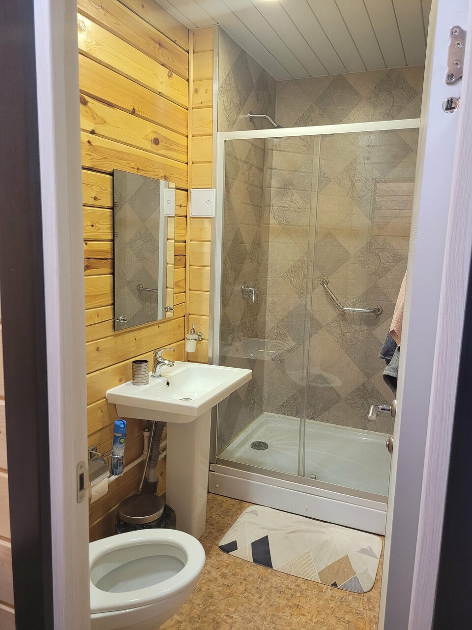 Отдыхали в трехместном номере. Номер стандартный без излишеств, все нужное присутствует, тепло. Общая кухня где можно приготовить покушать, холодильник, микроволновка, плита, фильтр на воду, диван, телевизор. Есть душ, совмещённый с туалетом и в другом конце коридора еще один туалет. Есть стиральная машинка. Мы заказывали ужин в столовой при гостинице — карельский лосось- порция огромная очень вкусно и сытно, ходили в баню (на фото)- чисто и уютно, есть пирс — для купания в Белом море после баньки. Очень приятное чистое и спокойное место.