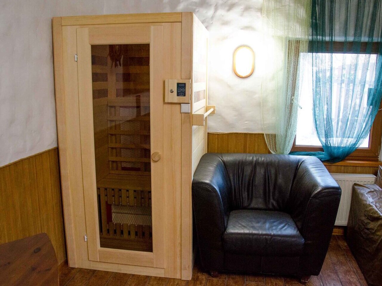 Русская Парная полностью выполнена из натуральной древесины ,площадью 12 кв м ,Кроме того посетители этого гостевого номера смогут воспользоваться:большой деревянной купелью, чтобы остудить тело ,цена указана за час до 6 человек !