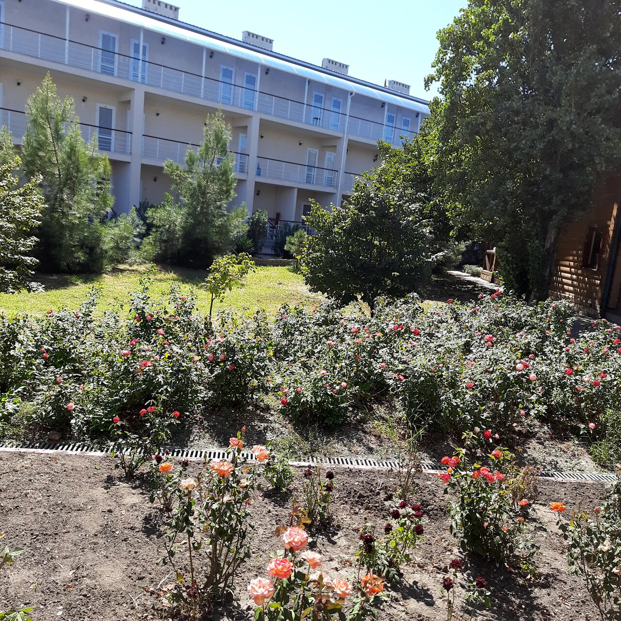 Отдыхали с женой и внуком с 1.0821 по 11.08.21.Хороший отель,номер стандарт,телевизор холодильник,кондиционер,туалет,душ.Жили на втором этаже корпус 3.Приехали поздно но успели поужинать в ресторане.Персонал приветливый но бар в ресторане после 20.00 не работает.Сходили на пляж к морю,там небольшой бар есть но выбор небольшой пиво,вино.Пляж чистый песок,лежаки есть,но хватает не всем.Акватория удобная дно песчаное идти можно далеко и не бояться что утонешь.Море теплое с утра чистое но после обеда приносило водоросли и медуз но отдыха это не испортило.На территории отеля по ходу на пляж есть бассейн но для взрослых он маловат,территория отеля чистая ухоженная много роз и других цветов.Из развлечений детская анимация,для взрослых дискотека бильярд.В ресторане отличное питание но он тесноват.В целом отдыхом остались довольны,на следующий год если будет возможность приедем сюда снова.