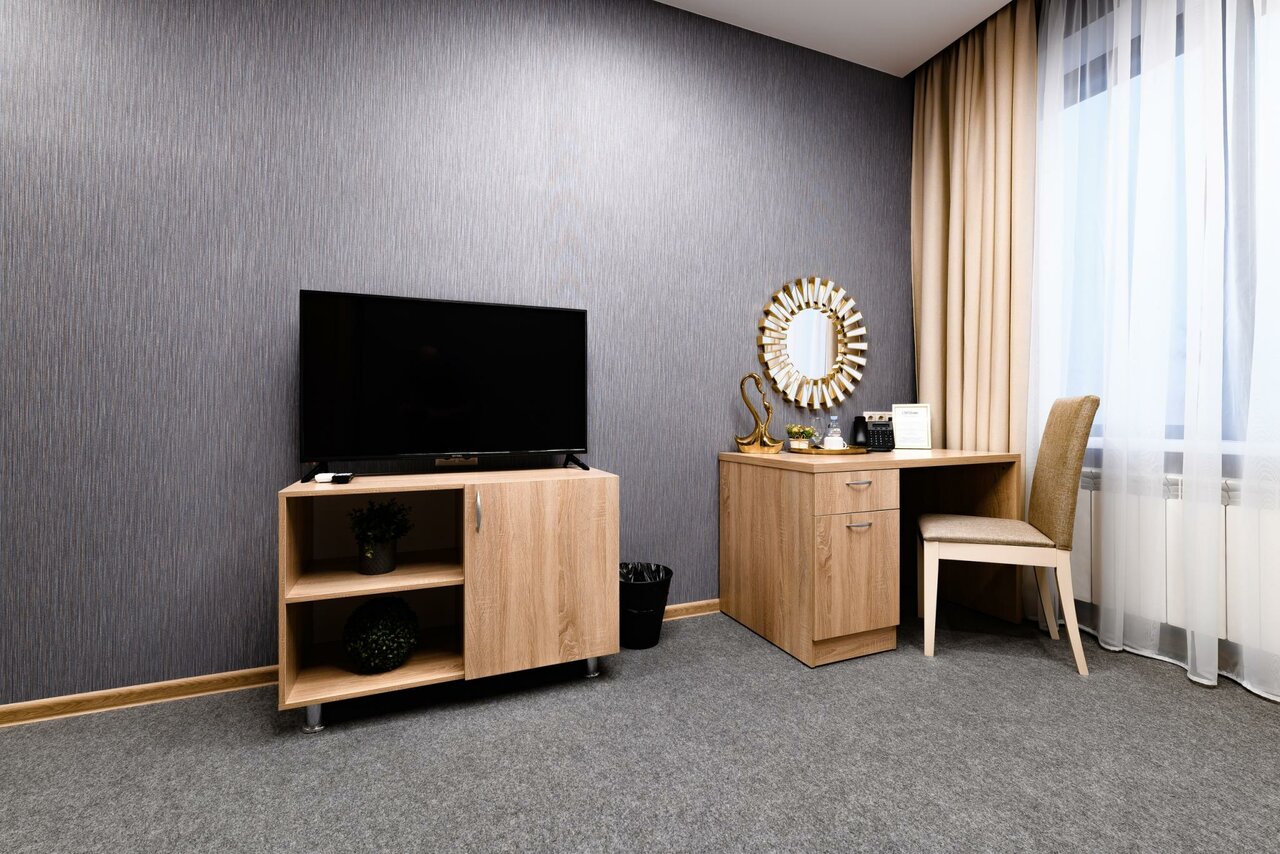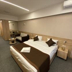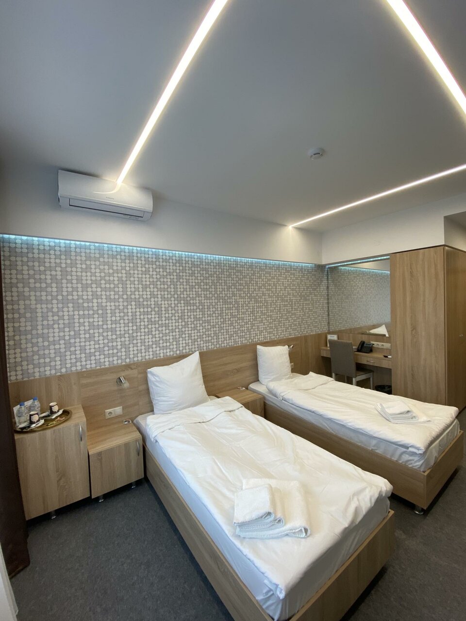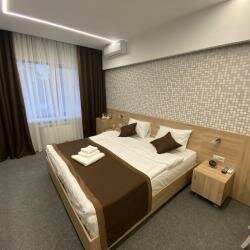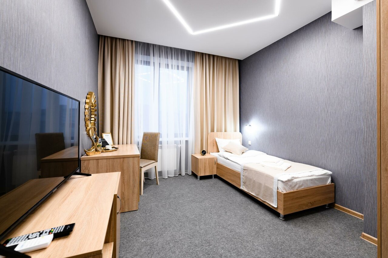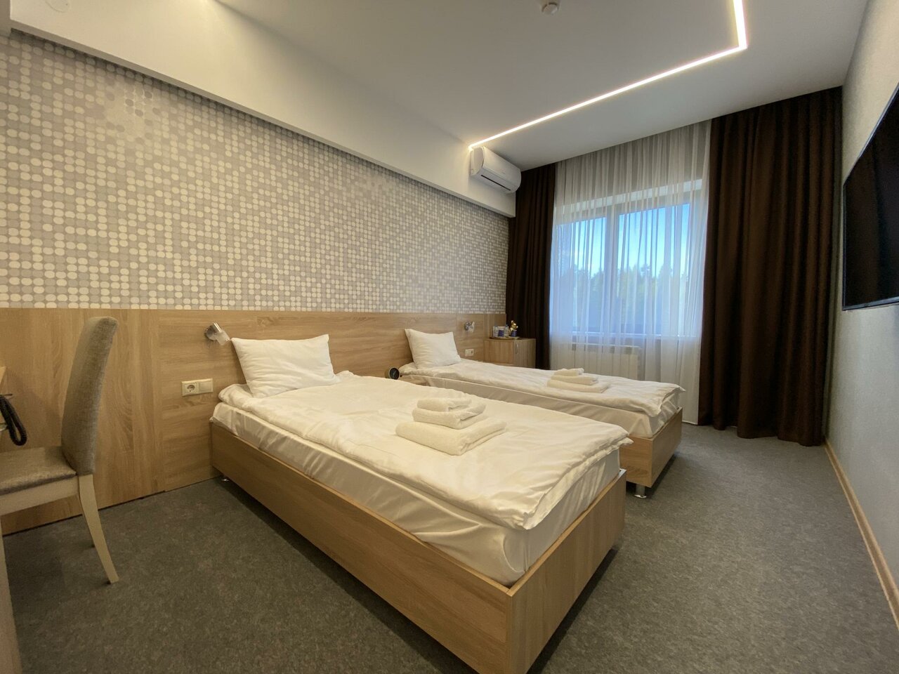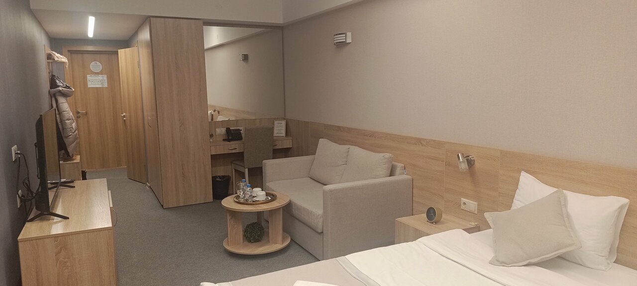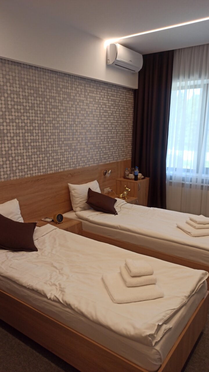 Хороший просторный номер. В номере есть всё необходимое — полотенца, тапочки, фен, всё для гигиены. Девочки на рецепе все очень приветливые! Есть ресторан. Везде чистота и порядок. Есть парковка. Так же завтраки есть, выбор маленький, но вкусно. Рекомендую!