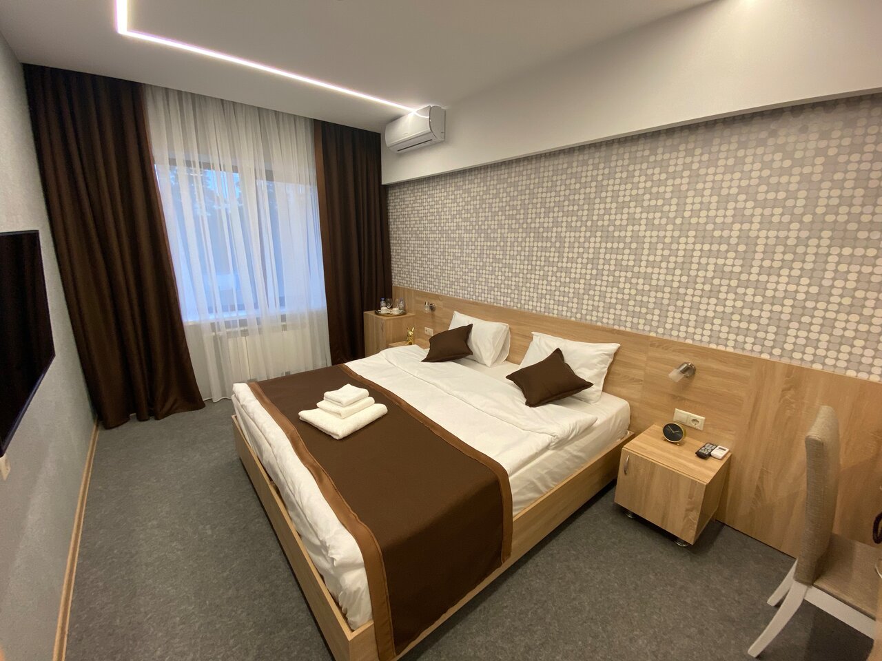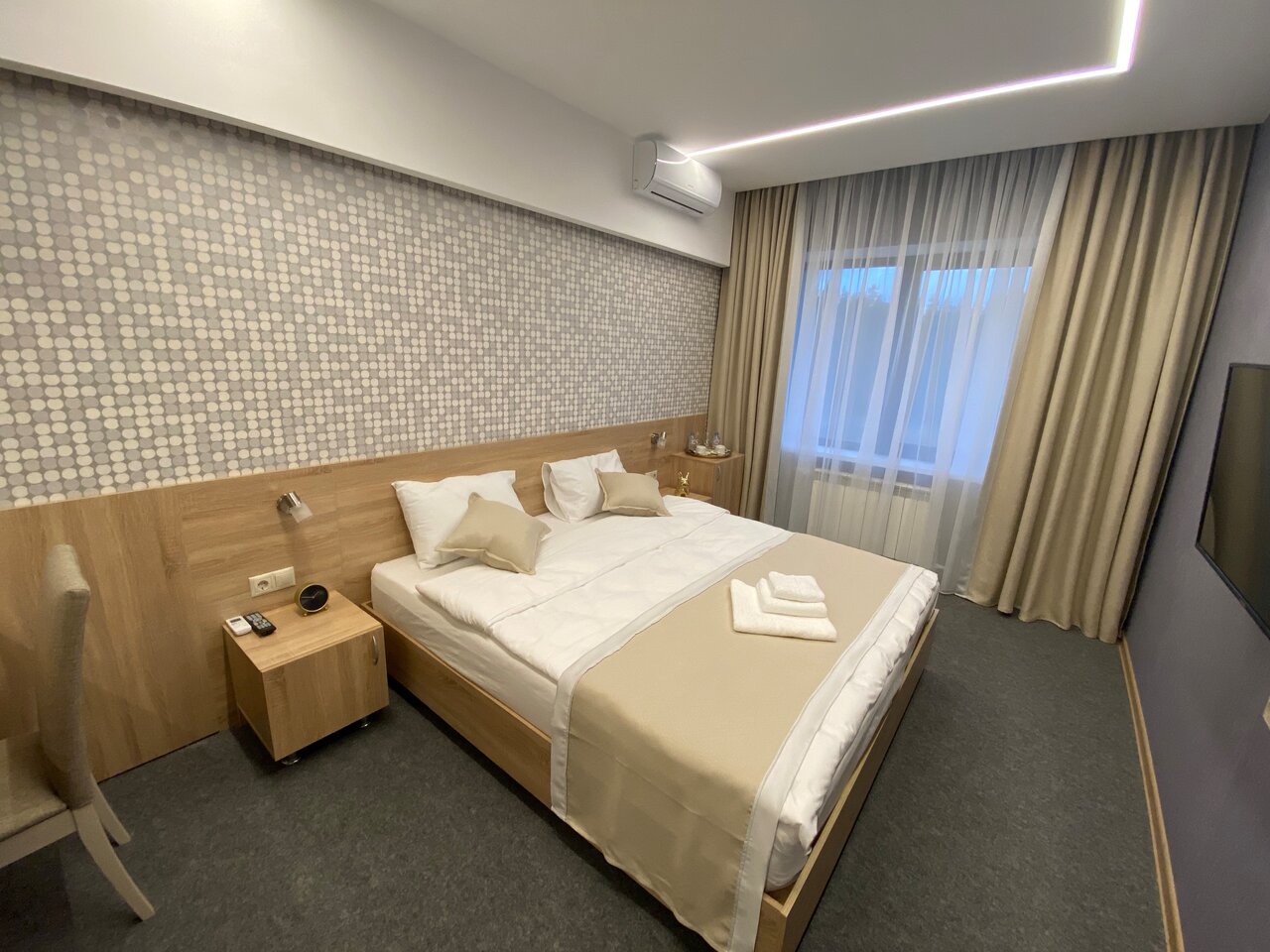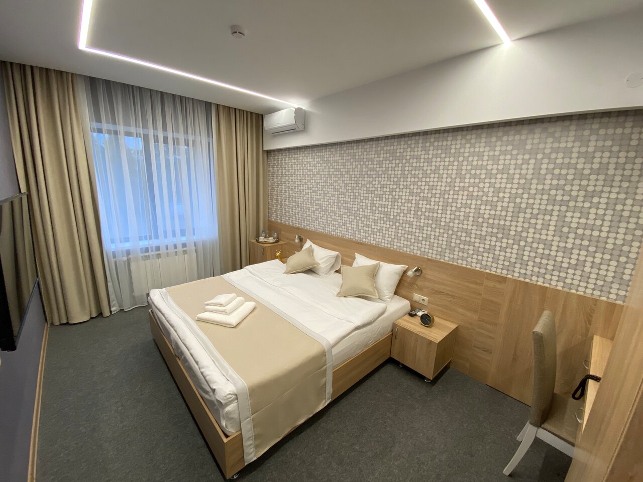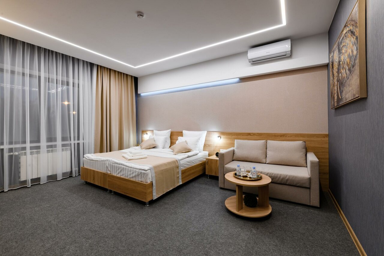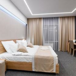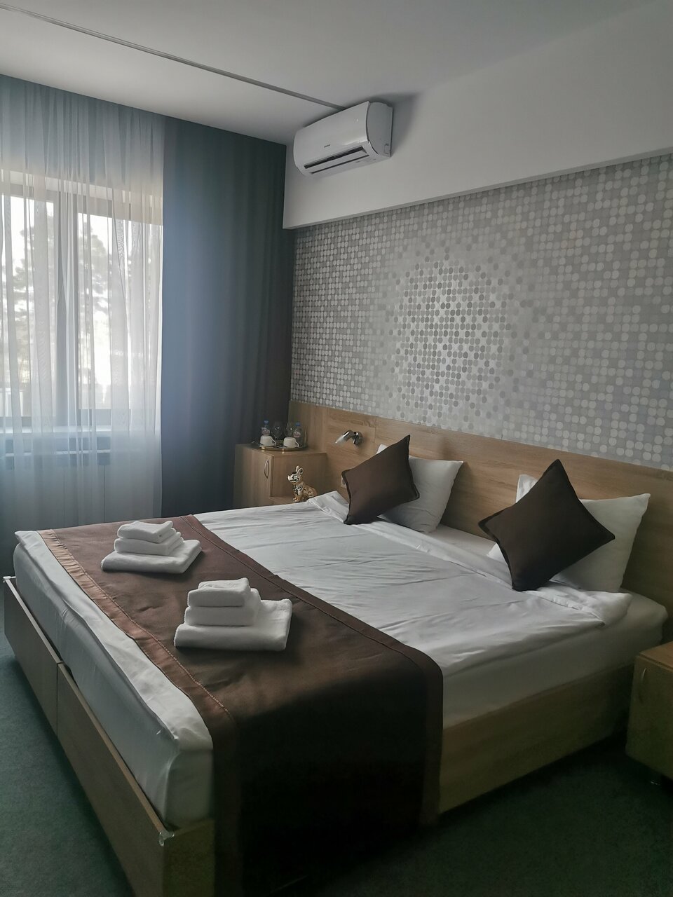 Хороший просторный номер. В номере есть всё необходимое — полотенца, тапочки, фен, всё для гигиены. Девочки на рецепе все очень приветливые! Есть ресторан. Везде чистота и порядок. Есть парковка. Так же завтраки есть, выбор маленький, но вкусно. Рекомендую!