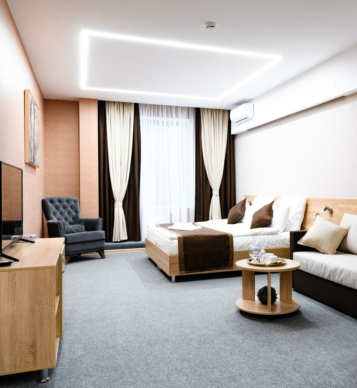 хороший номер, интересный интерьер отеля, вкусные завтраки, приветливый персонал. в отеле есть ресторан и кафе, по этому может быть немного шумно. из дополнительных удобств в номере есть кондиционер и большой телевизор, есть холодильник.