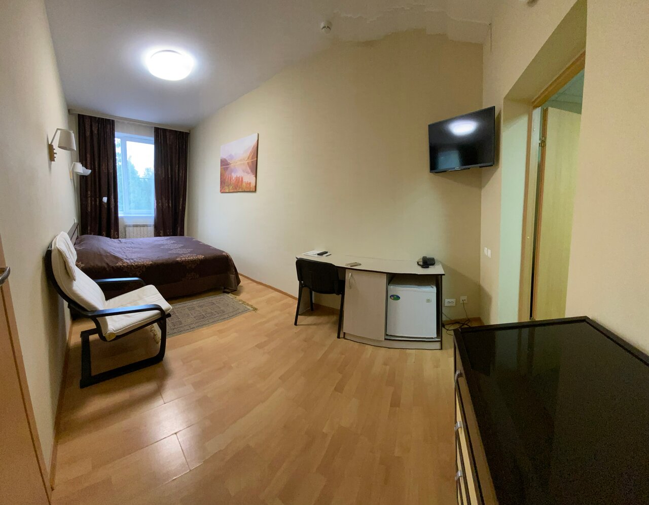 Услуги: — Номера от 4500 до 6000 ₽ за ночь (санузел, Wi-Fi, телевизор, чайник, микроволновка, фен, халаты). — Бесплатная парковка, трансфер (платный), камера хранения, прачечная. — Столовая, кафе, доставка еды в номер, новогодний ужин. — Звукоизоляция, гипоаллергенные номера, ускоренная регистрация. — До центра города — менее 2 км.